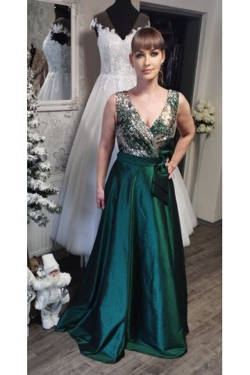 Velikost šatů je 42, barva šatů je zelená, šaty jsou vzadu na zip, vrchní díl je zdobený krajkou a flitrama v barvě šatů, delší rozparek na předním díle, křidýlkový rukávek, třpytivý materiál. Obvod hrudi je 96 cm, obvod pasu je 80 cm, obvod boků je 140 cm, délka šatů od průramku je 136 cm. Tyto šaty jsou naprosto ideální volbou na svatební a koktejlové večírky!