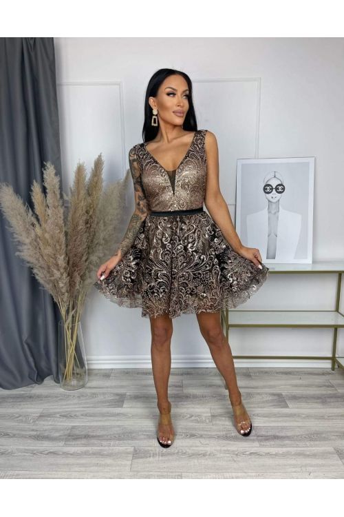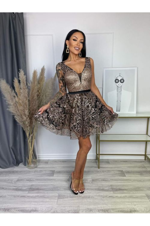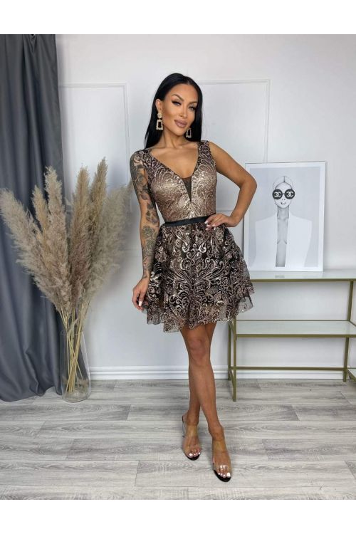 Nádherné flitrové krátké šaty, tylová černá spodnice, podšívka šatů je tělové barvy. Černý pásek v pase umožní zdůraznit a odhalit Vaši postavu. Vzadu jsou šaty na zip. Tento výrobek byl vyroben z vysoce kvalitního materiálu. Složení: 95% polyester, 5% elastan. Tyto šaty jsou naprosto ideální volbou na svatební a koktejlové večírky!