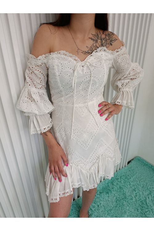 Dámské bílé krátké společenské šaty LOU s rukávem. Ohromující španělština inspirovaná modelem Lou, příjemný lehký materiál. Díky dírkované látce a jemným volánkům působí velmi lehce a dívčím dojmem. Šaty jsou vzadu na zip. Velikost šatů je M: obvod hrudi 80cm, obvod pasu 72cm, obvod boků 88cm. Tyto jedinečné šaty s volánky jsou vyrobeny z vysoce kvalitního materiálu a budete v nich nejen pohodlně, ale také skvěle vypadat. Tento model se skvěle hodí k sandálům nebo nazouvákům jak pro každodenní nošení tak i na elegantní stylizace.