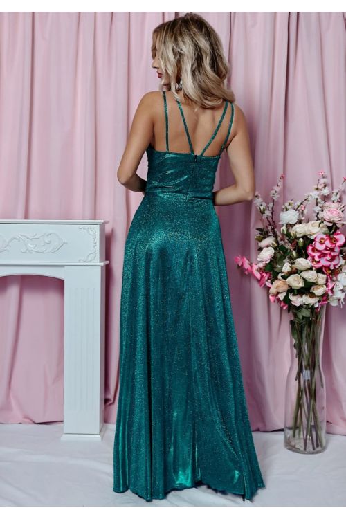 Velikost šatů je 40. Barva šatů je zelená. Třpytivý mírně elastický materiál. Šaty jsou na prsou střižené do véčka, mají tenká dvojitá ramínka. V pase krásně zdůrazní štíhlý pas. Vzadu jsou na dlouhý zip a jsou bez podšívky. Materiál je lehoučký a splývavý. Obvod hrudníku je 92 cm, obvod pasu je 80 cm, obvod boků je 130 cm, délka šatů od průramku je 131 cm. Tyto šaty jsou naprosto ideální volbou na svatební a koktejlové večírky!