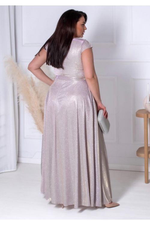 Velikost šatů je 50, barva šatů je šampaň. Šaty jsou z třpytivého mírně elastického materiálu. Na prsou jsou šaty střižené do véčka a mírně nabrané v boku. V pase mají šaty vázačku, přední díl šatů je zdobený větším rozparkem a jsou bez podšívky. Vzadu jsou šaty na delší zip. Materiál je krásně splývavý a lehoučký. Tyto šaty jsou naprosto ideální volbou na svatební a koktejlové večírky!