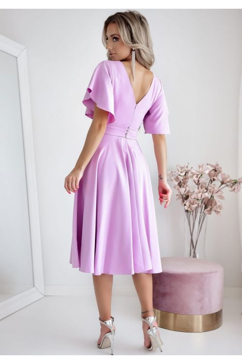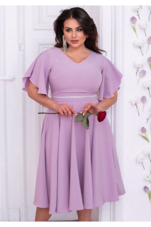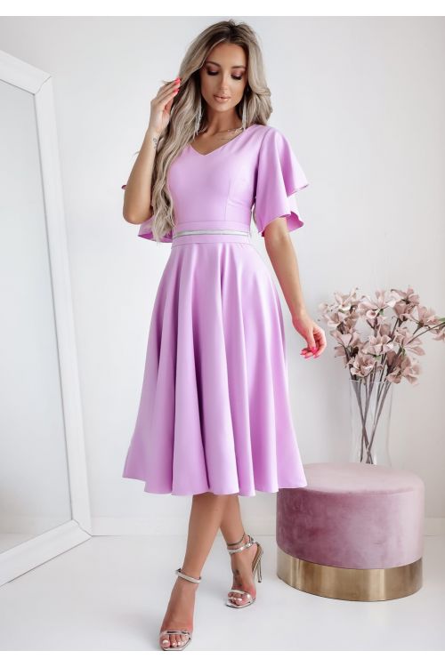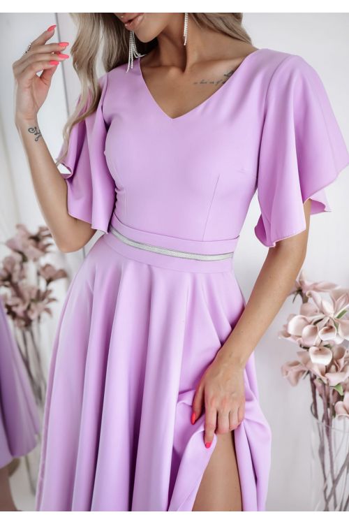 Šaty jsou krásného střihu v lila barvě. Šaty mají delší rukávek. Ozdobný pásek krásně zdůrazní Váš štíhlý pas. Vzadu jsou šaty na zip a nemají podšívku. Materiál je krásně splývavý. Šaty jsou ve velice módní midi délce. Tyto šaty jsou naprosto ideální volbou na svatební a koktejlové večírky!