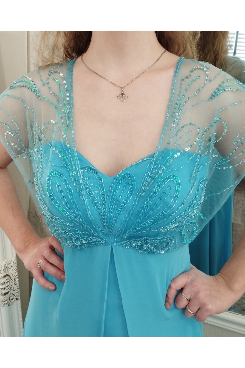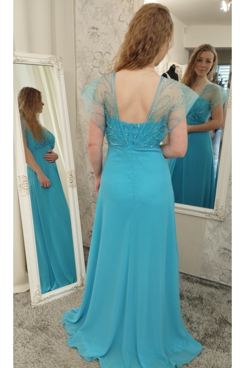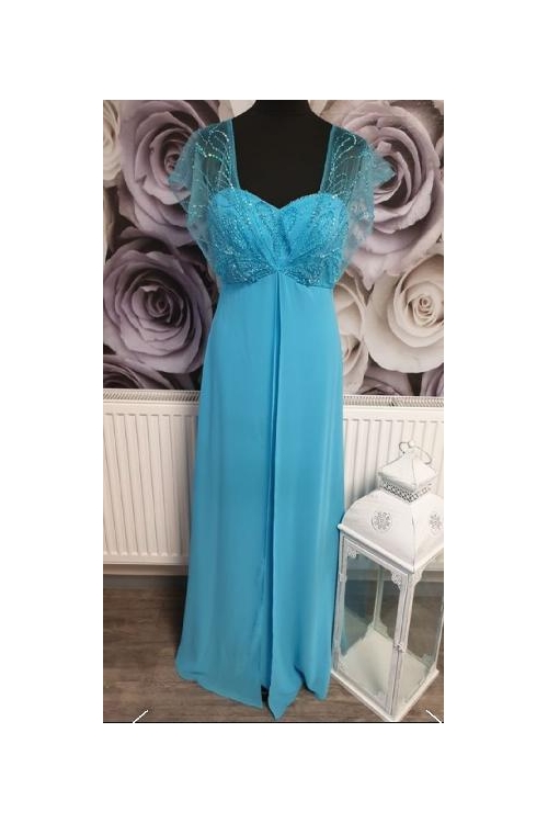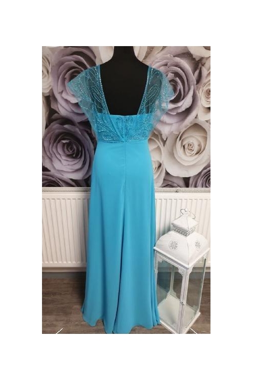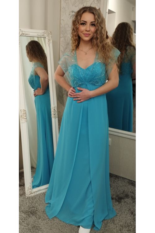 Dámské společenské dlouhé světle modré šaty IRIS s tylovým rukávkem. Šaty jsou krásně zdobené perličkami a flitry. Vzadu jsou na zip, podšívka je saténová. Složení: 100% polyester. Velikost šatů je 38: obvod hrudi je 87cm, obvod pasu je 72cm, obvod boků je 92cm, délka šatů od průramku je 136cm. Tyto šaty jsou vyrobeny z vysoce kvalitního materiálu a budete v nich nejen pohodlně, ale také skvěle vypadat.