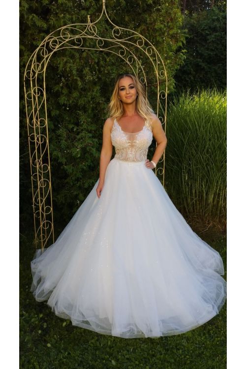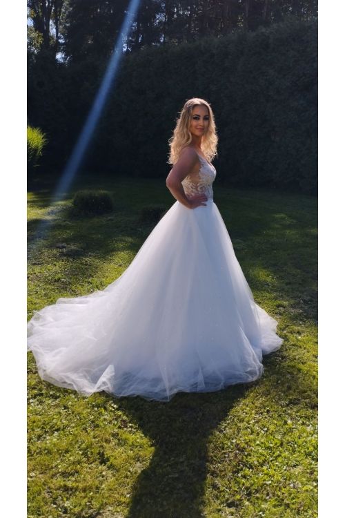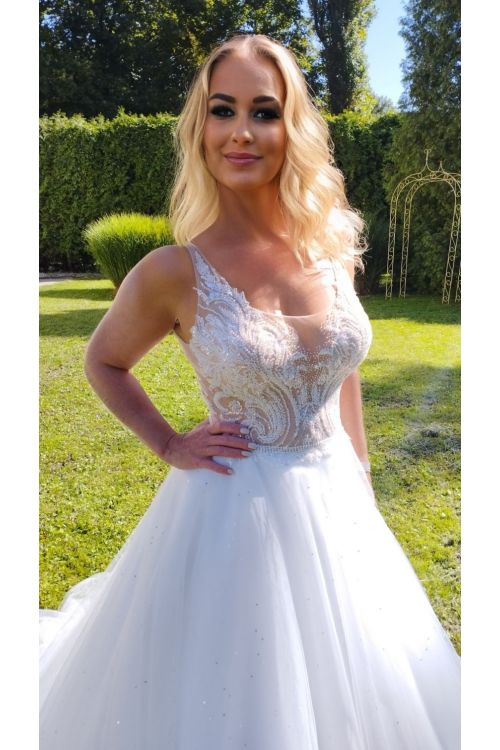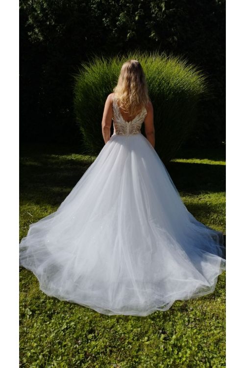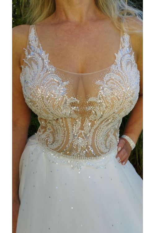 Velikost šatů je 36-38. Vrchní díl šatů je z tělového tylu, na tomto vrchním díle jsou šaty zdobeny krajkou, flitry a perličkami. Sukně je bílá, bohatá a zdobená flitry. Šaty mají krásnou vlečku. Vzadu jsou šaty na zip a průsvitné knoflíčky. V těchto svatebních šatech budete vypadat vždy stylově. Bez ohledu na to, kde se nacházíte se budete cítit jako v pohádkové romantice!
