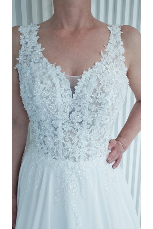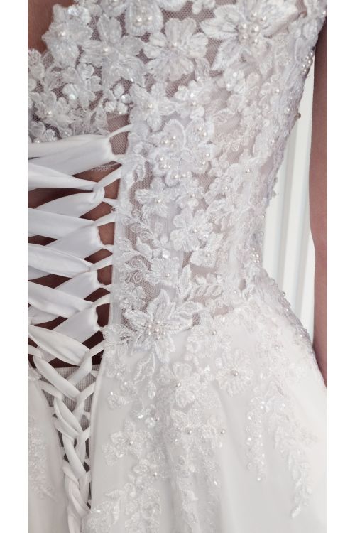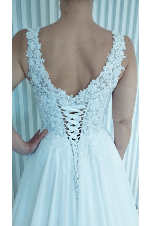 Velikost šatů je 36-38. Vrchní díl šatů je z tělového tylu, na tomto vrchním díle jsou šaty zdobeny krajkou, flitry a perličkami. Sukně je bílá, bohatá a zdobená flitry. Šaty mají krásnou vlečku. Vzadu jsou šaty na zip a průsvitné knoflíčky. V těchto svatebních šatech budete vypadat vždy stylově. Bez ohledu na to, kde se nacházíte se budete cítit jako v pohádkové romantice!