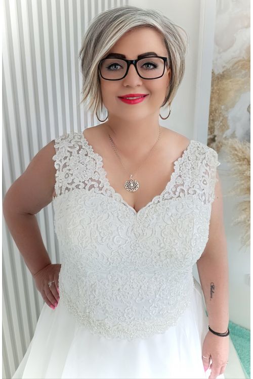 Vrchní díl šatů je zdobený krakou, prsa jsou mírně vyztužená. Šaty mají široké ramínka. Mají nádhernou bohatou sukni a kratší vlečku. Vzadu jsou šaty na šněrování. Materiál je 100% polyester. Tento model umožňuje odhalit a zdůraznit Vaši postavu. Bez ohledu na to, kde se nacházíte se budete cítit jako v pohádkové romantice!