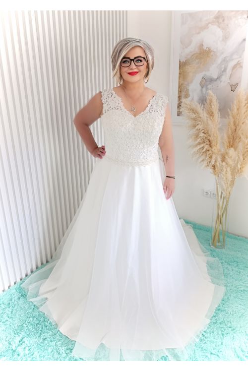 Velikost šatů je 38. Šaty jsou v barvě ivory. Jsou tylové zdobené krajkou na předním díle. Rukávky mají tylové, zapínají se na knoflíček. Šaty mají lehkou podšívku a kratší vlečku. Vzadu jsou šaty na zip. Obvod hrudníku...83 cm, obvod pasu...68 cm, obvod boků...110 cm, délka šatů od průramku...146 cm. Tyto dlouhé šaty ukazují okouzlující křivky. Bez ohledu na to, kde se nacházíte se budete cítit jako v pohádkové romantice!