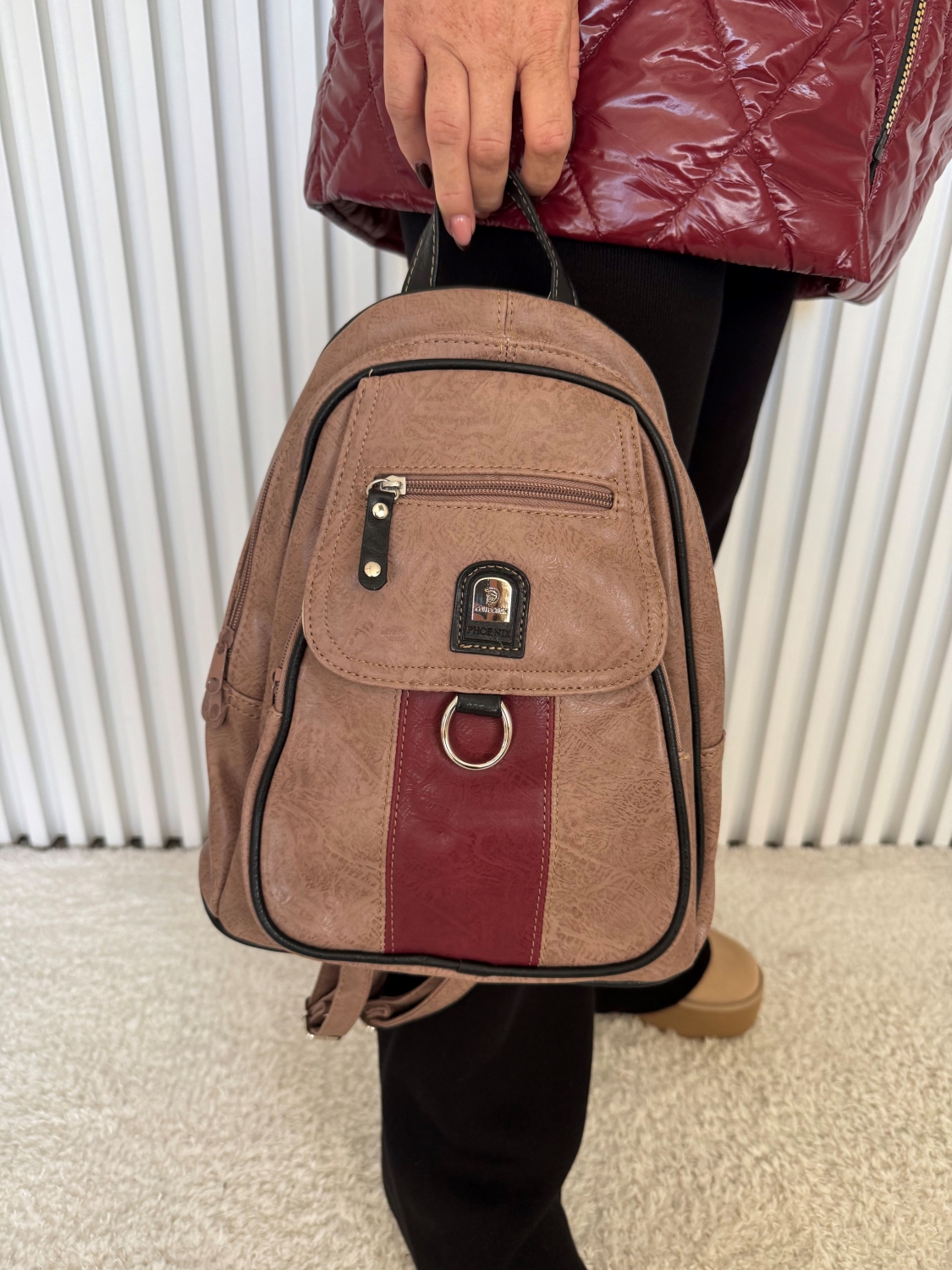 Dámský batoh v hnědé barvě s výrazným vínovým pruhem