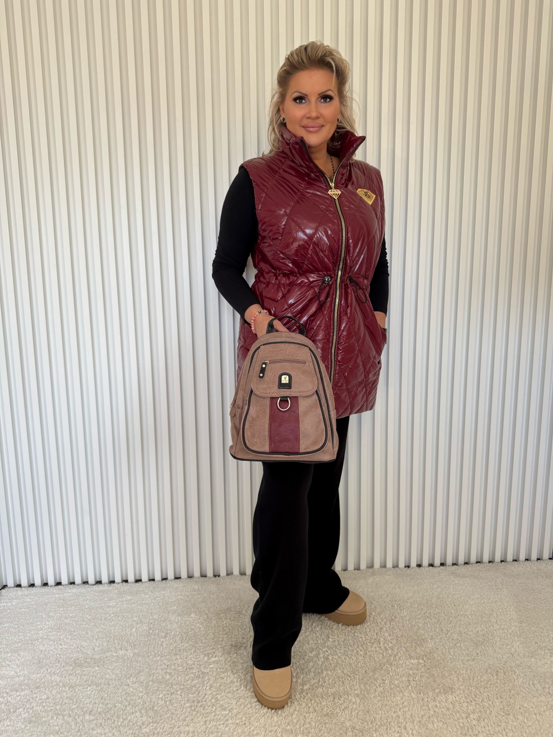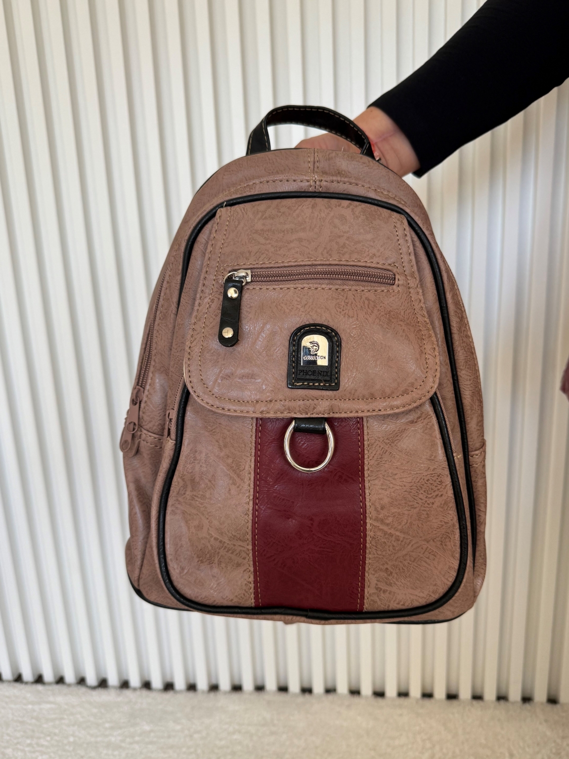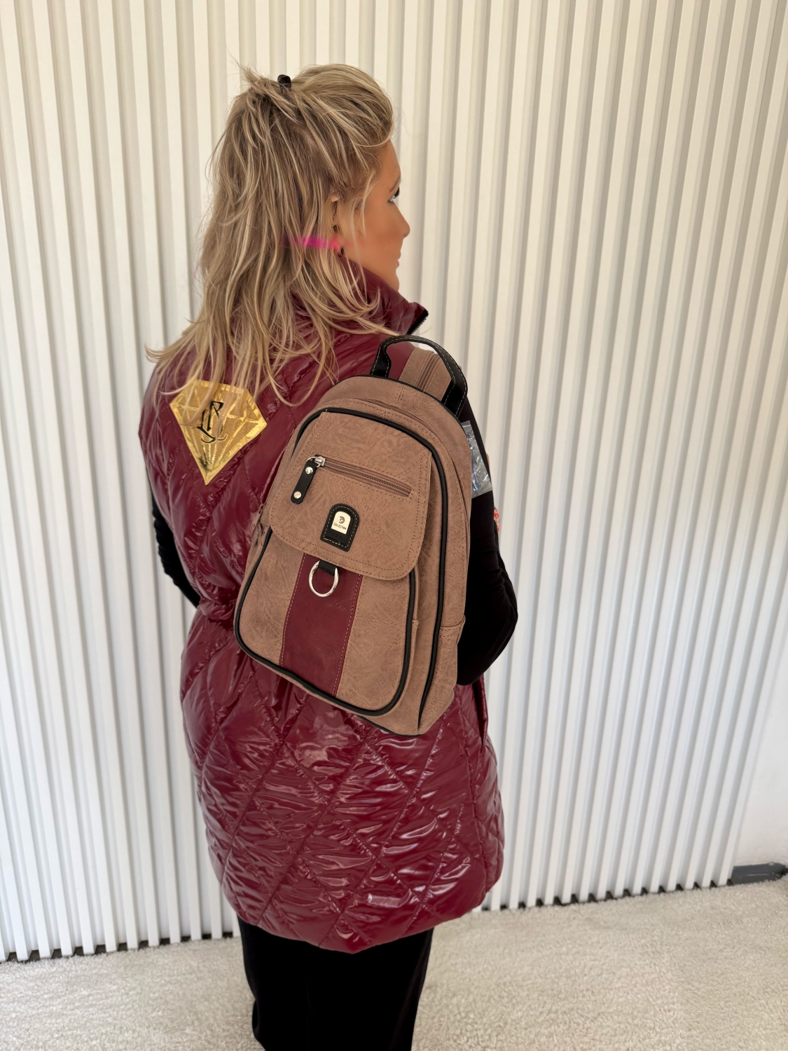 Dámský batoh v hnědé barvě s výrazným vínovým pruhem.