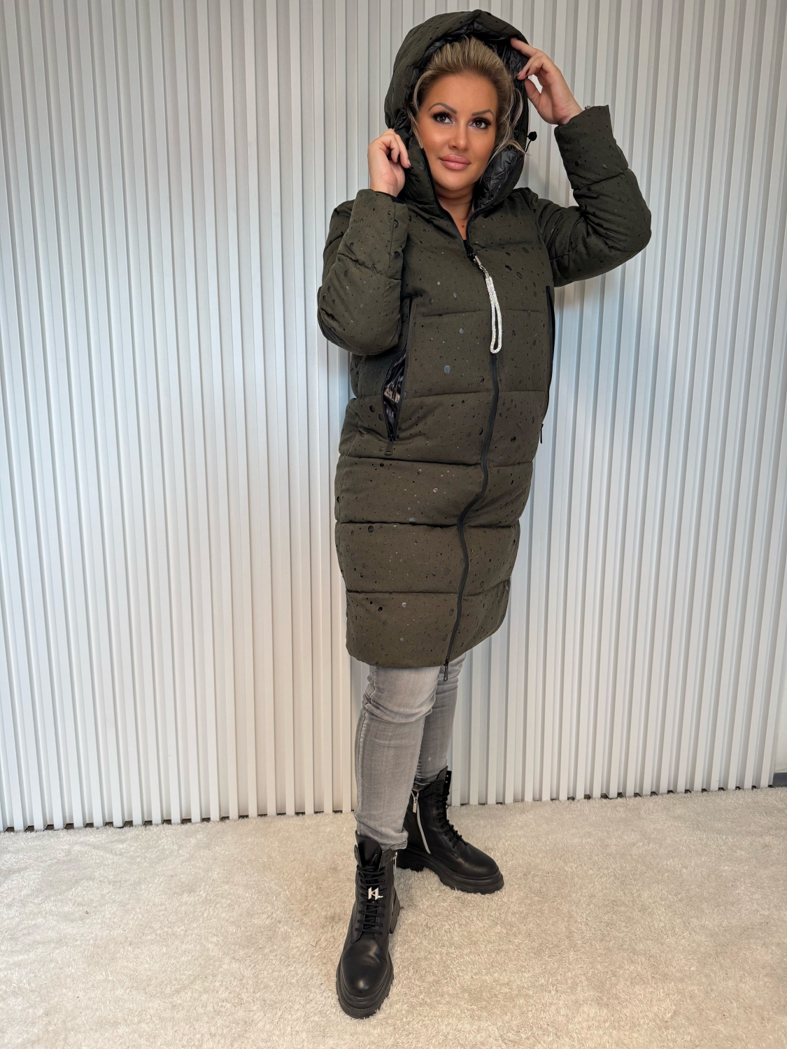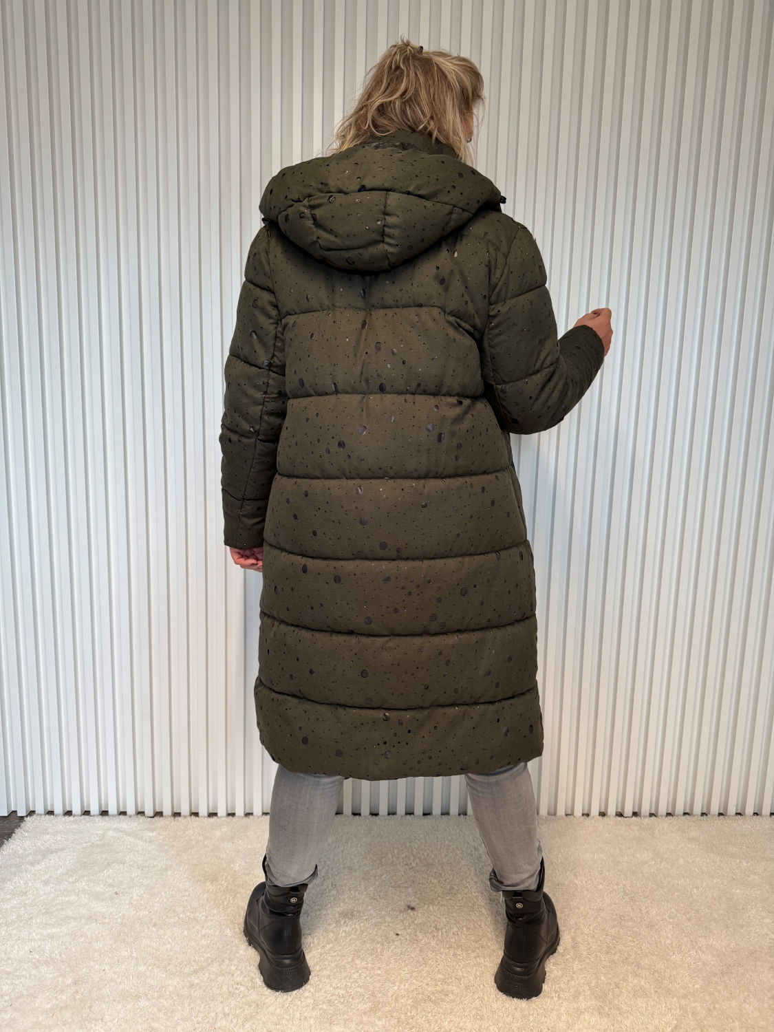 Dámská dlouhá khaki bunda s plastickým vzorem černých koleček. Bunda se zapíná na zip a má 2 velké kapsy na předním díle také na zip. Kabát má kapuci, která nelze odepnout. Skvělá stylová bunda , která tě zahřeje.