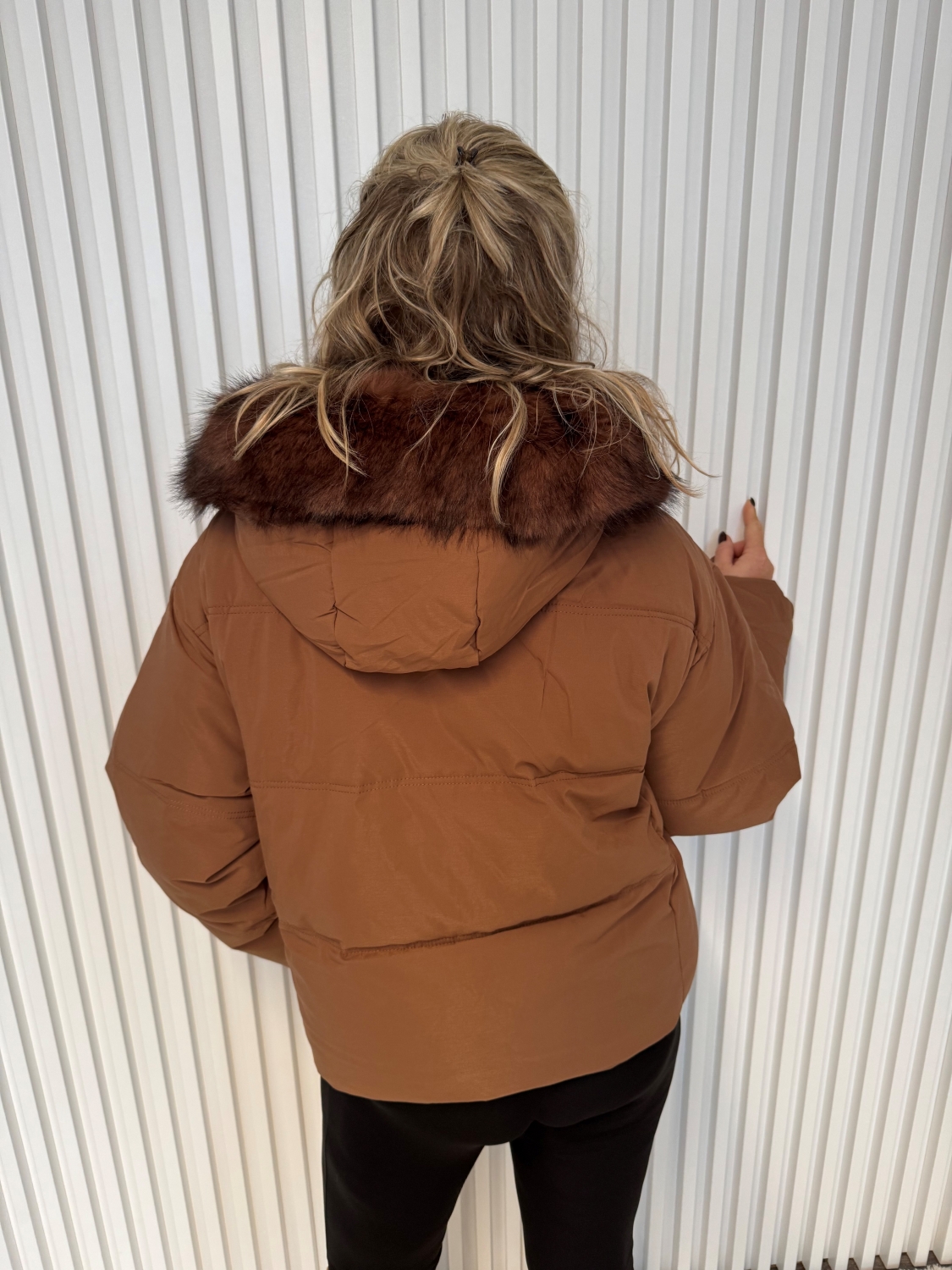 Dámská dlouhá zimní bunda s kapucí v khaki barvě.