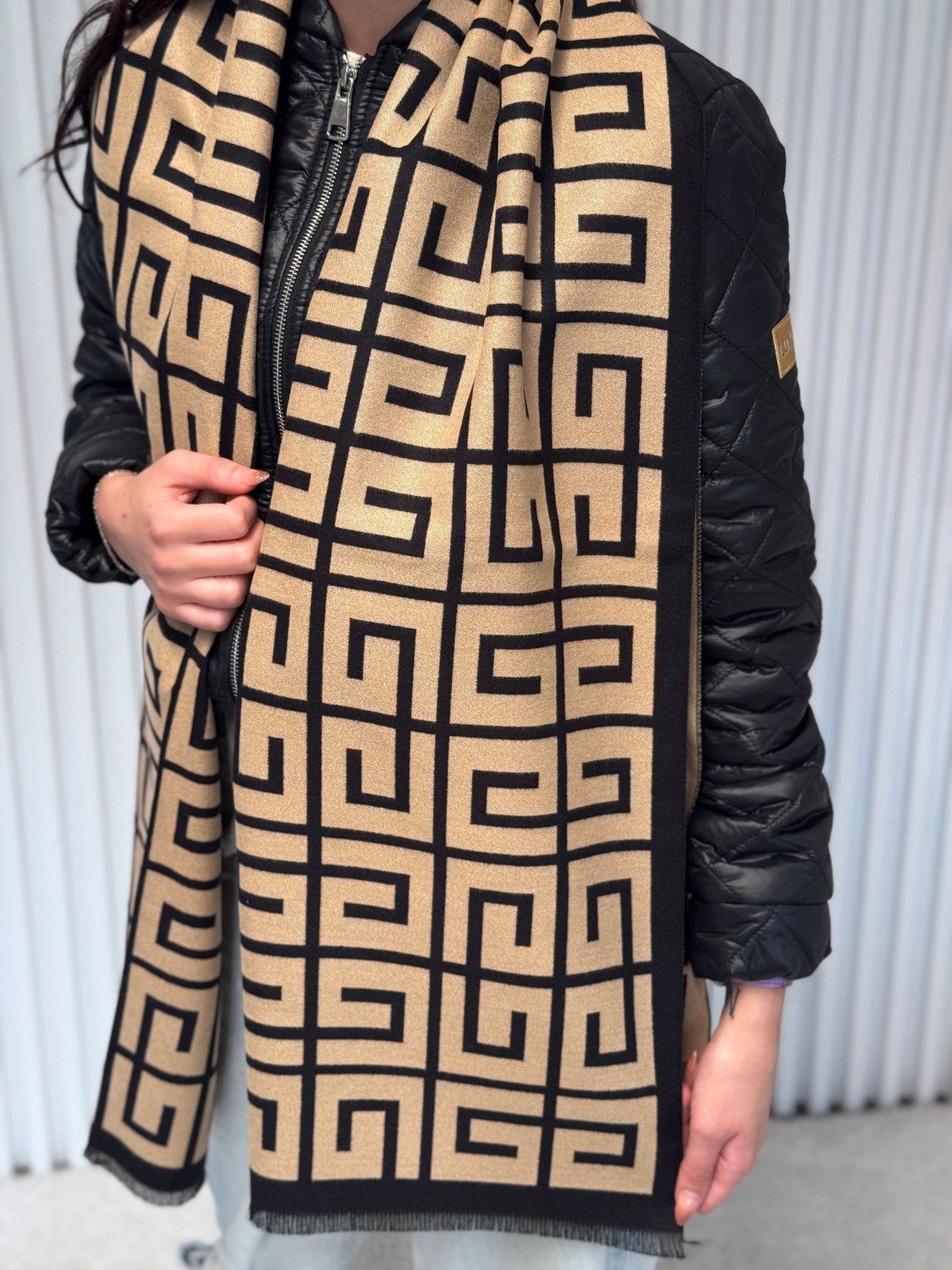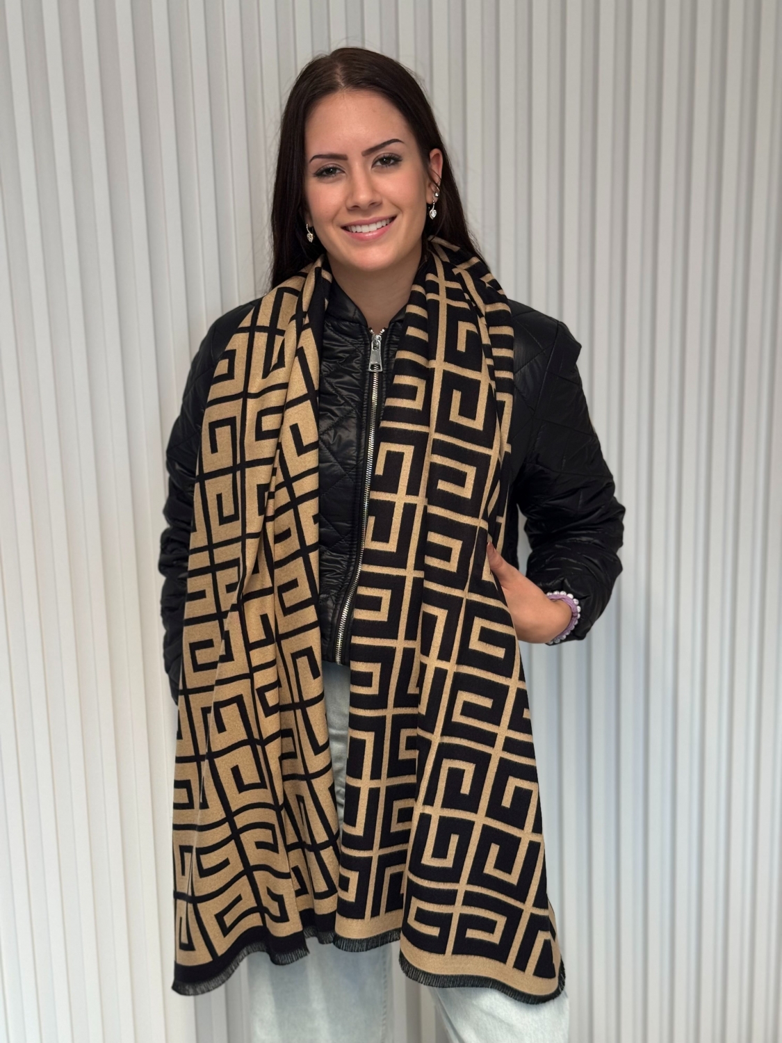 Elegantní oboustranná šála s výrazným geometrickým vzorem je dokonalým doplňkem pro každodenní i elegantní outfit.