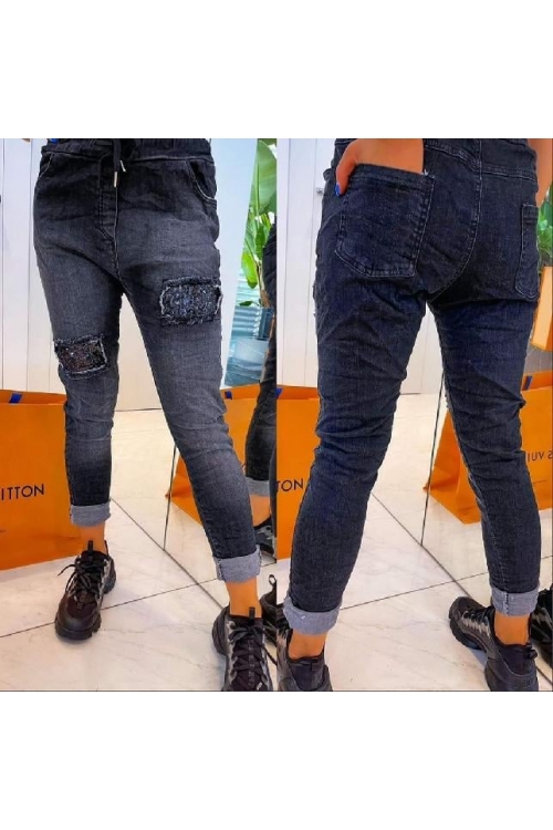Dámské černé elastické rifle ve velikosti 50, 52,54. Rifle mají na zadečku kapsy a po stranách jsou zdobené perličkami. Velikost 50 má obvod pasu 98 až 1O8 cm, obvod přes boky je 115 až 128 cm, délka je 100 cm. Velikost 52 má v pase 102 až 115cm, obvod přes boky je 118 až 136cm, délka je 100 cm. Velikost 54 má obvod pasu 105 až 120 cm, obvod přes boky je 120 až 140 cm, délka je 103cm. Klasický model pro různé stylizace