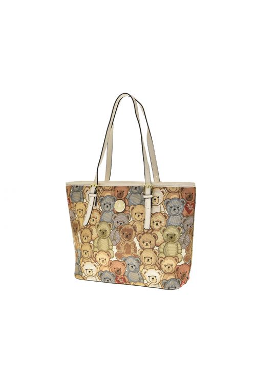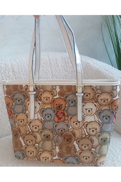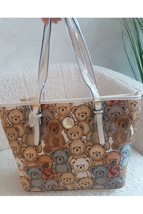 Dámská béžová kabelka z imitace kůže . Kabelka je zdobena medvídky . Medvídci jsou natištěny na textilií . Kabelka se zapíná na zip. Krásný model pro různé stylizace.