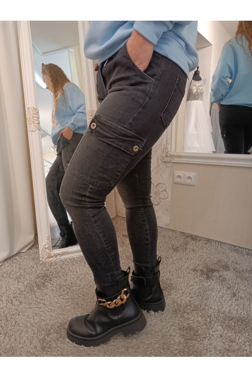 Dámské rifle Jolana. Tyto jeansy jsou v černé barvě, s kapsami. Materiál je elastický, pružný. Velikost - obvod pasu je 74-82cm, přes boky 96-110cm, délka 93 cm, obvod přes stehna 46-54cm. Velikost odpovídá velikosti 36 až 42. V pase je šňůrka na stažení.