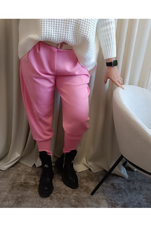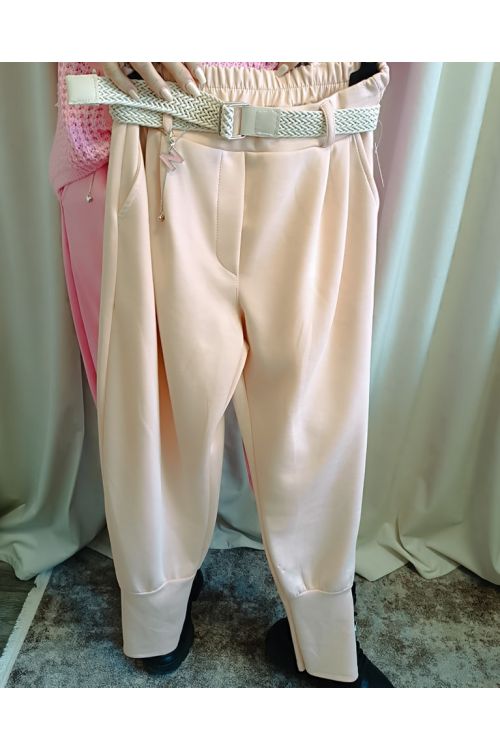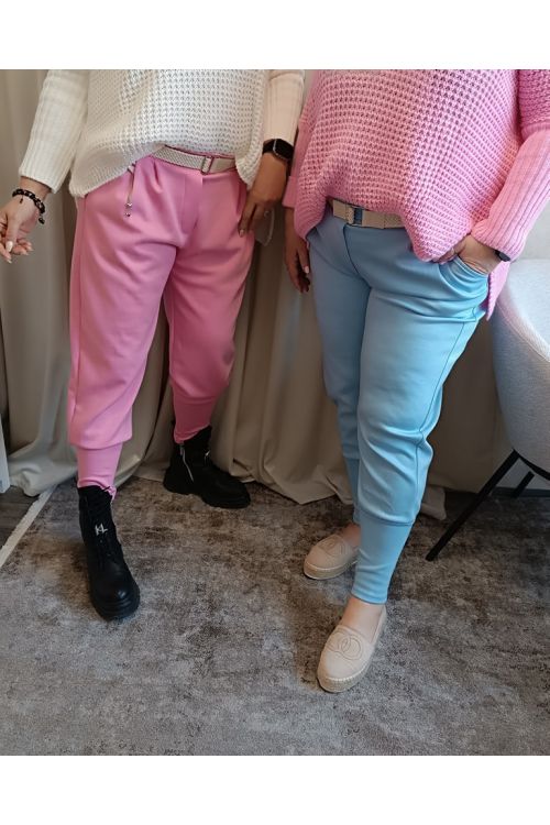Dámské elastické kalhoty s opaskem ve více barevných variantách. Kalhoty mají v pase gumu a dole náplety. Materiál hladký , příjemný, maselkový. Trendy model pro různé stylizace.