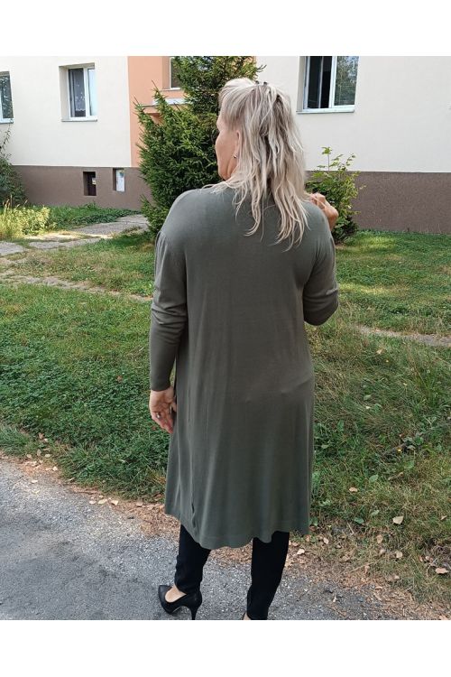 Dámský lehký kardigan v khaki a hnědé barvě. Velikost je UNI, ale jelikož se nosí rozevřený je vhodný pro větší i menší velikosti. Obvod přes prsa je 115 až 140 cm, délka je 105 cm. Materiál je tenký, elastický, nekousavý úplet. Model pro různé stylizace.