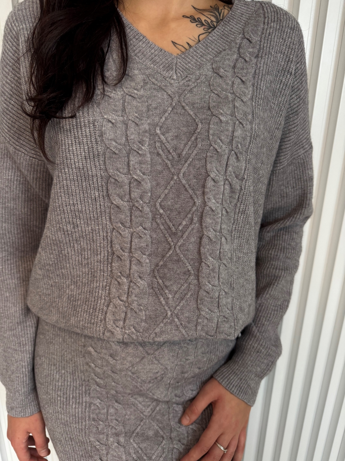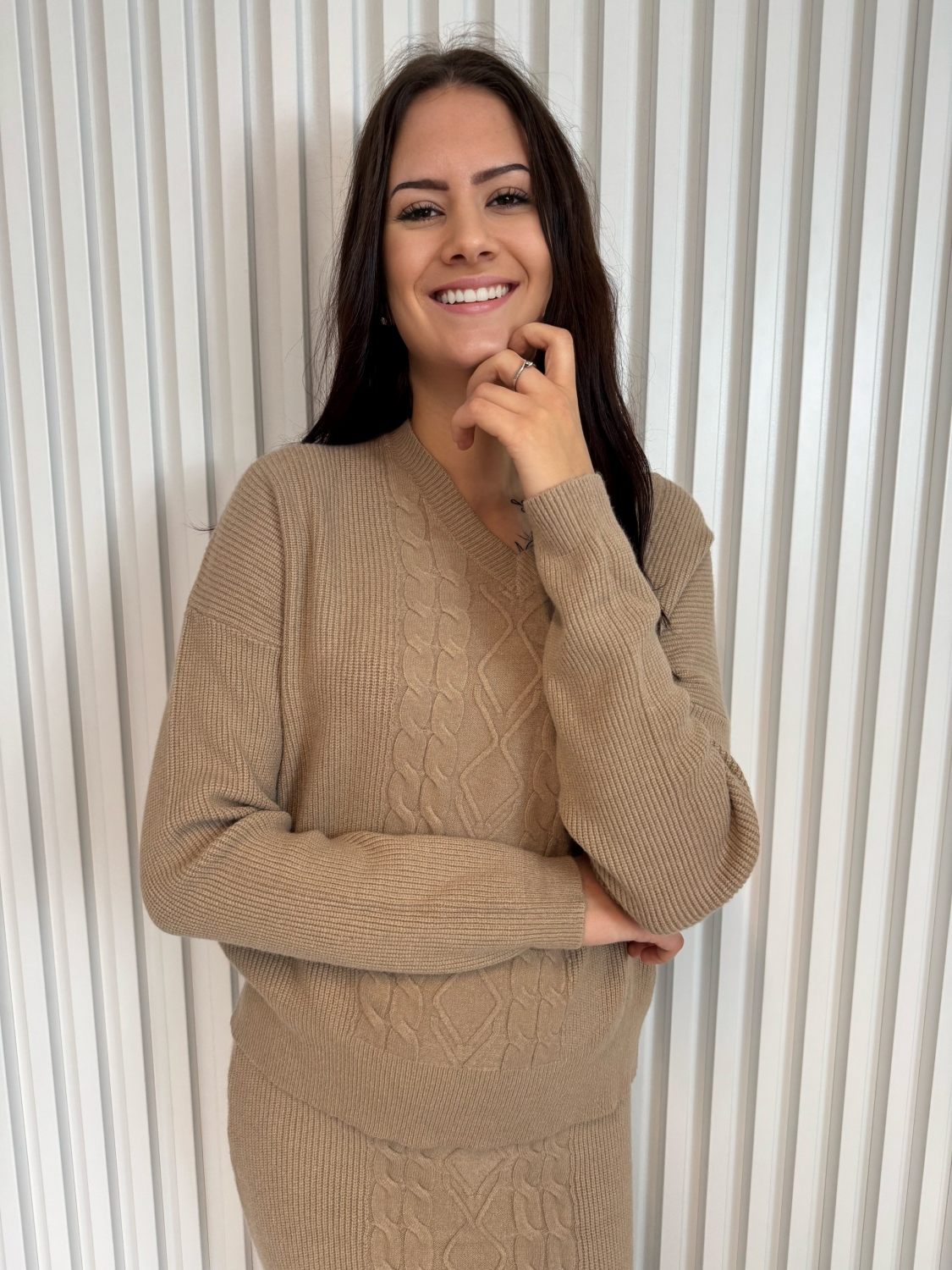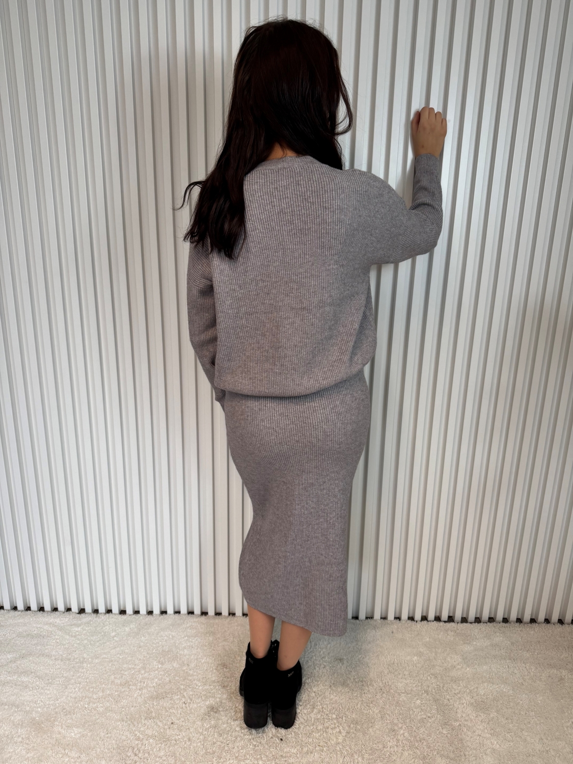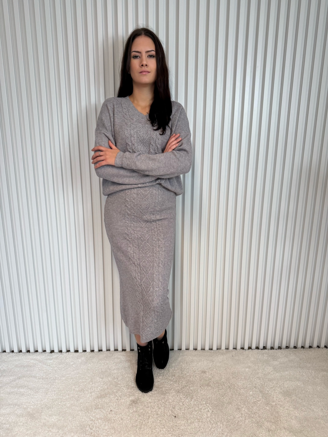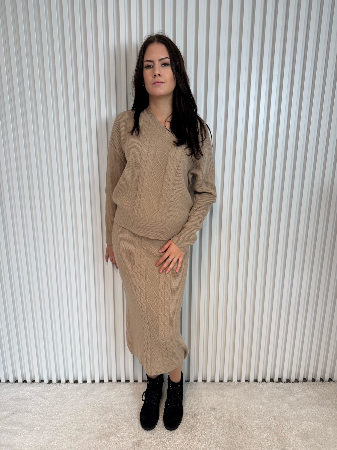 Stylový a pohodlný pletený komplet, který se skládá ze svetru a ladící midi sukně.