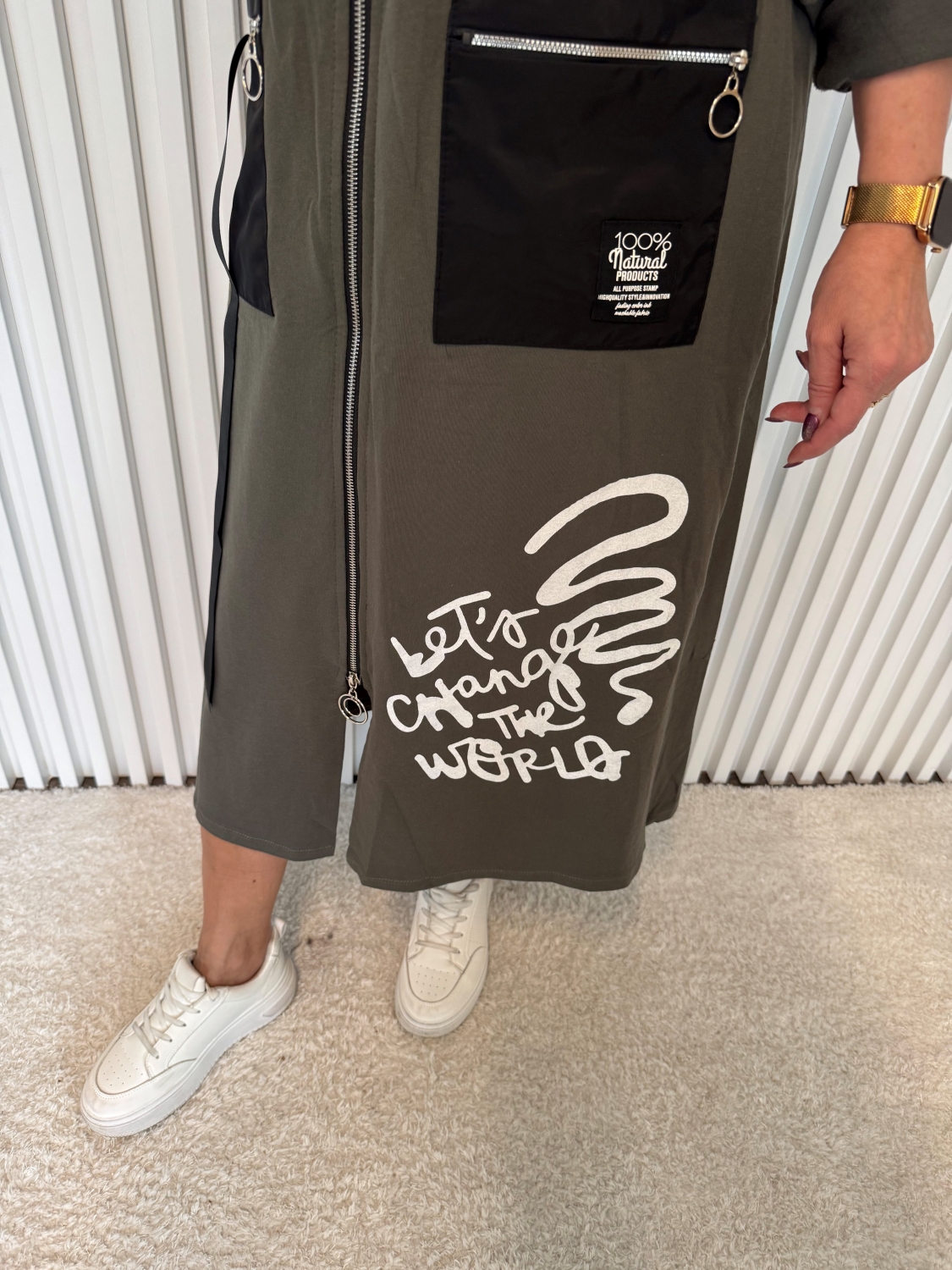 Sukně má praktické černé kapsy s ozdobnými zipy a nápisem, který outfitu dodává pozitivní energii a osobitý charakter.