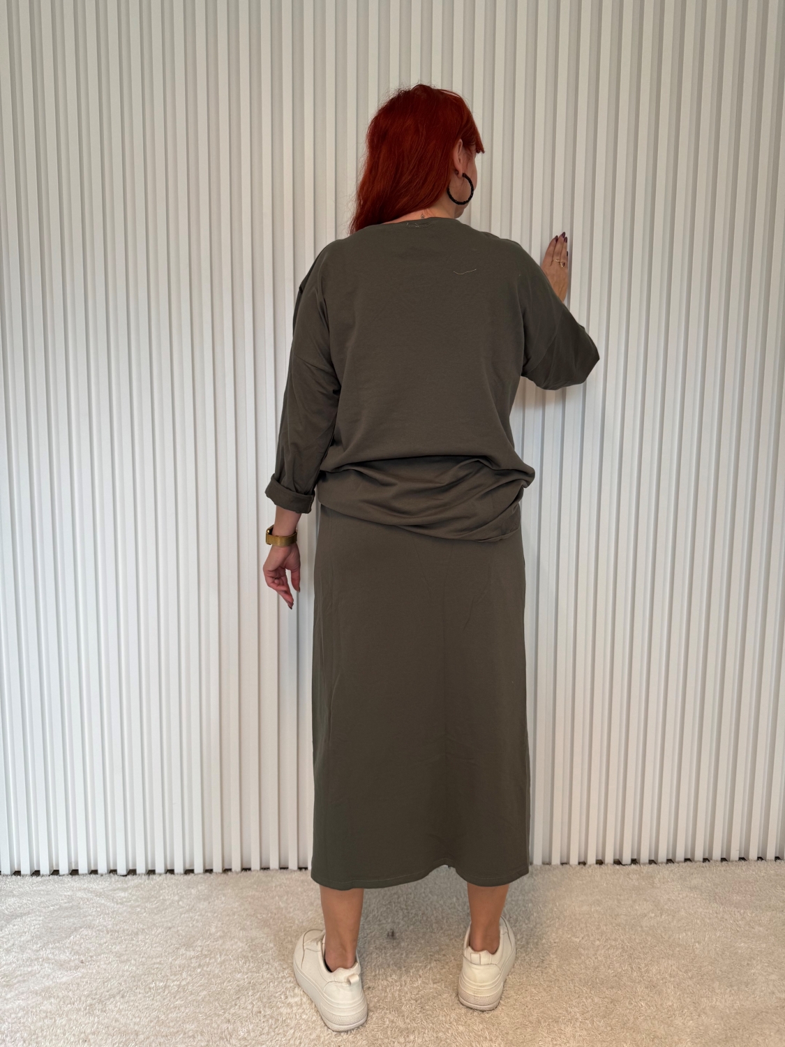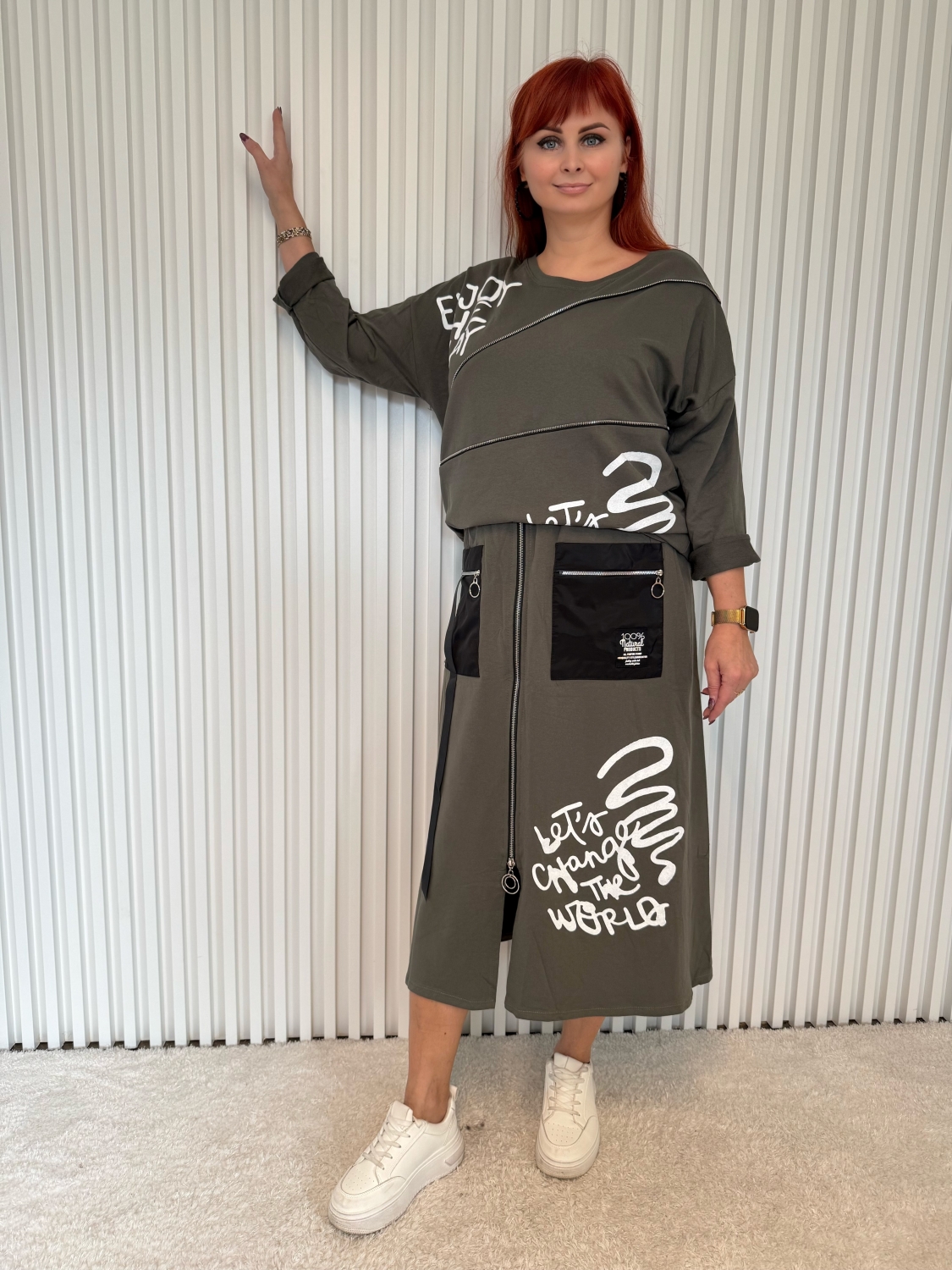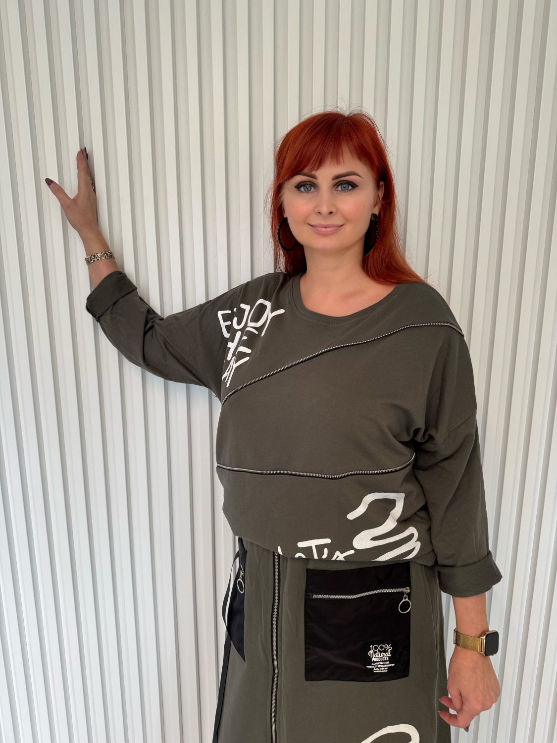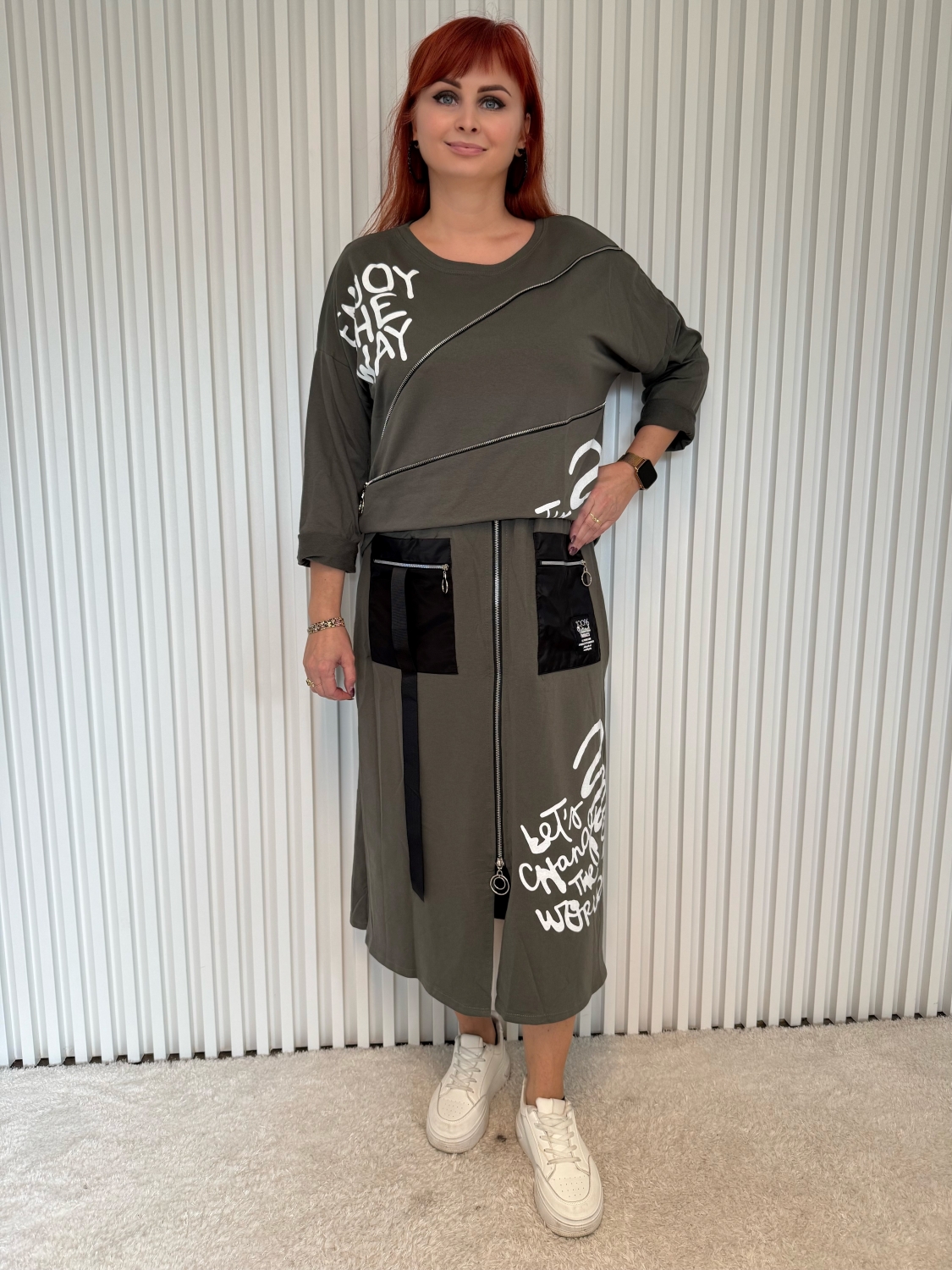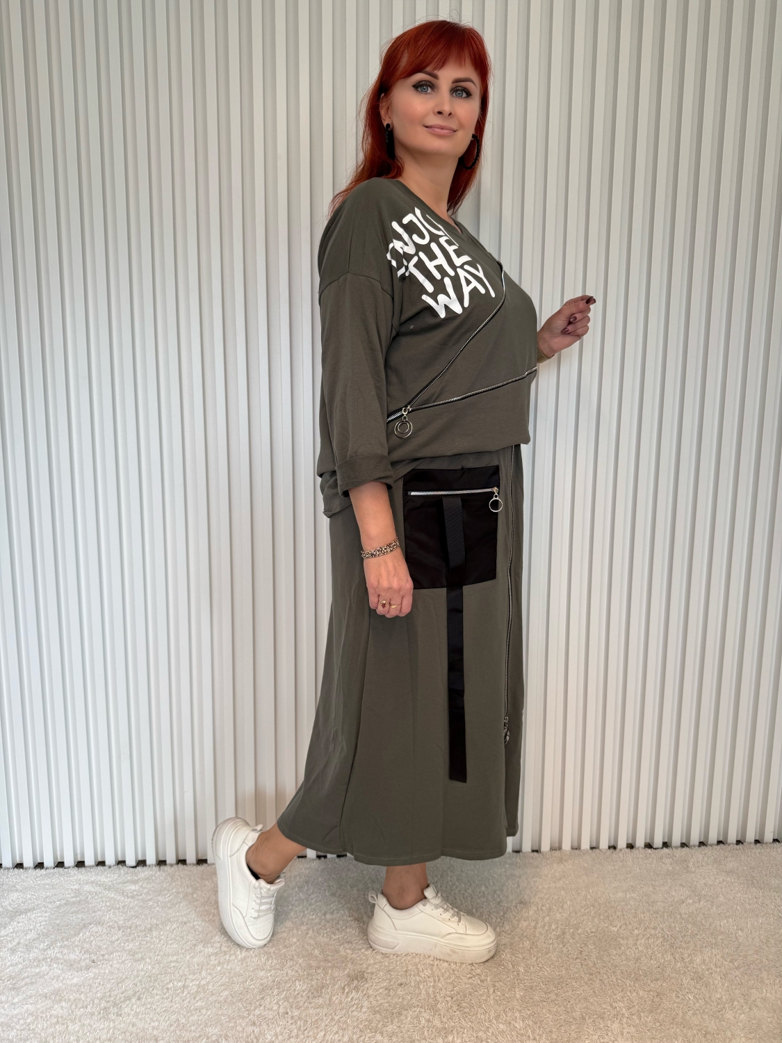 Moderní a pohodlný khaki komplet s nápaditými detaily je ideální volbou pro ženy, které chtějí být stylové i v běžný den.