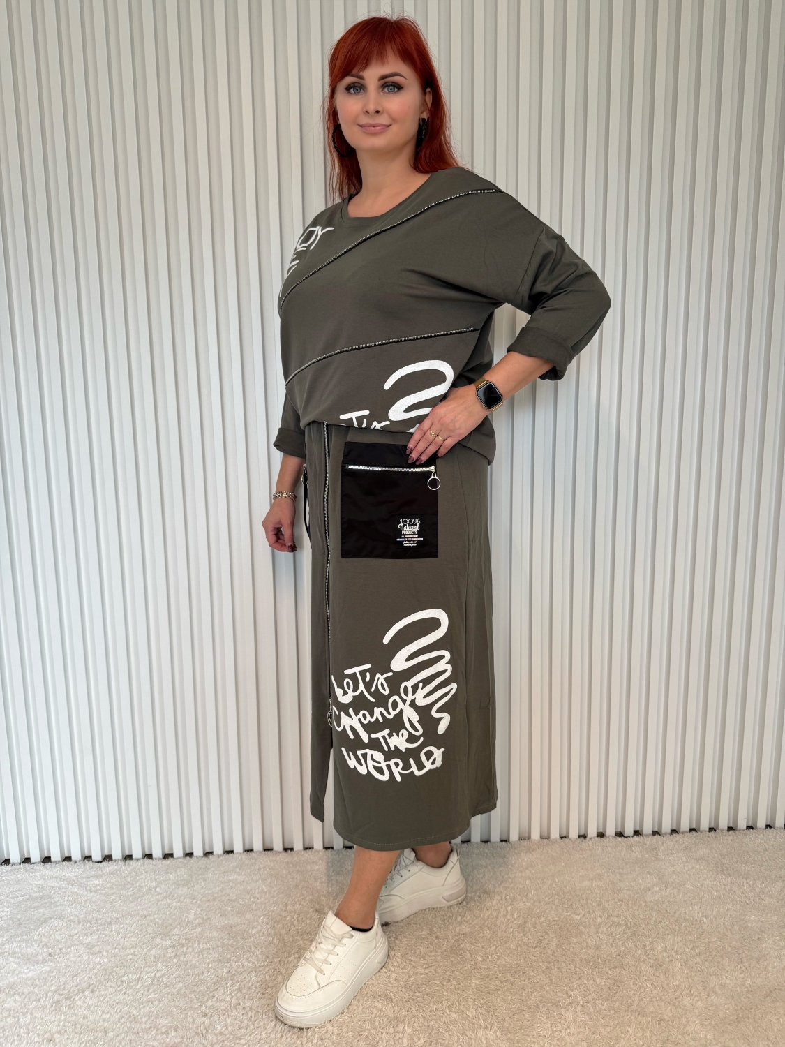 Volnější mikina s bílým potiskem krásně ladí s midi sukní v tomtéž odstínu.