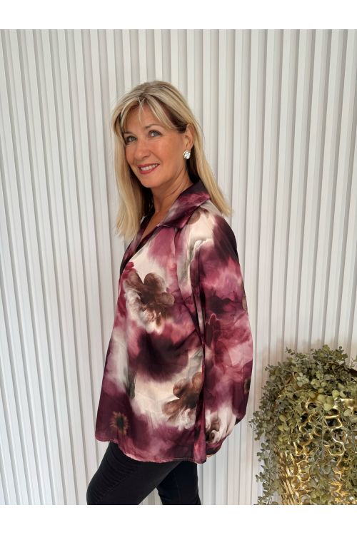 Elegantní saténová halenka ve stylovém barevném provedení spojujícím bordó, růžovou a hnědou je ideální volbou pro každou příležitost ať už hledáte outfit do práce, na večeři nebo jen chcete zazářit při každodenním nošení.