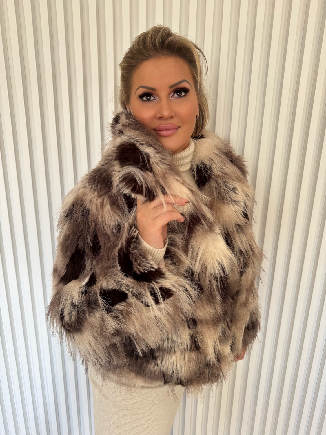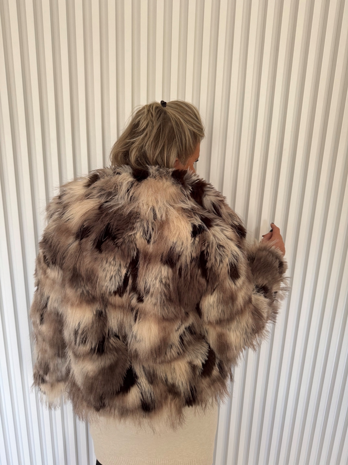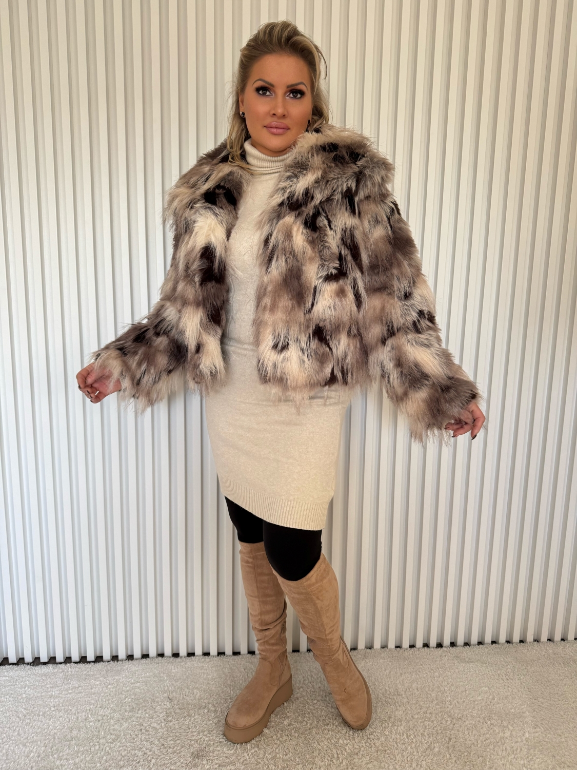 Dámský krémový kožich do pasu z umělé kožešiny.
