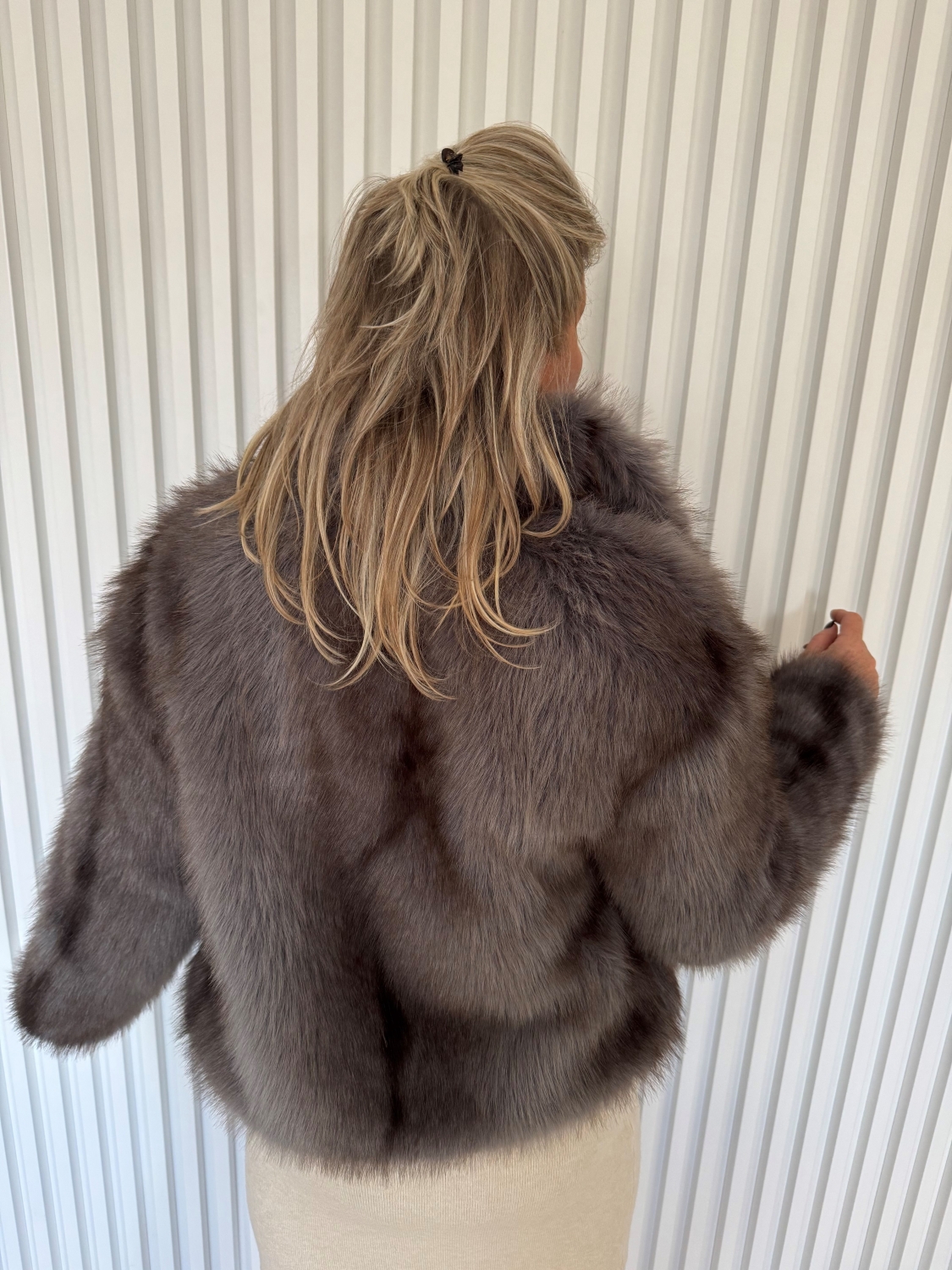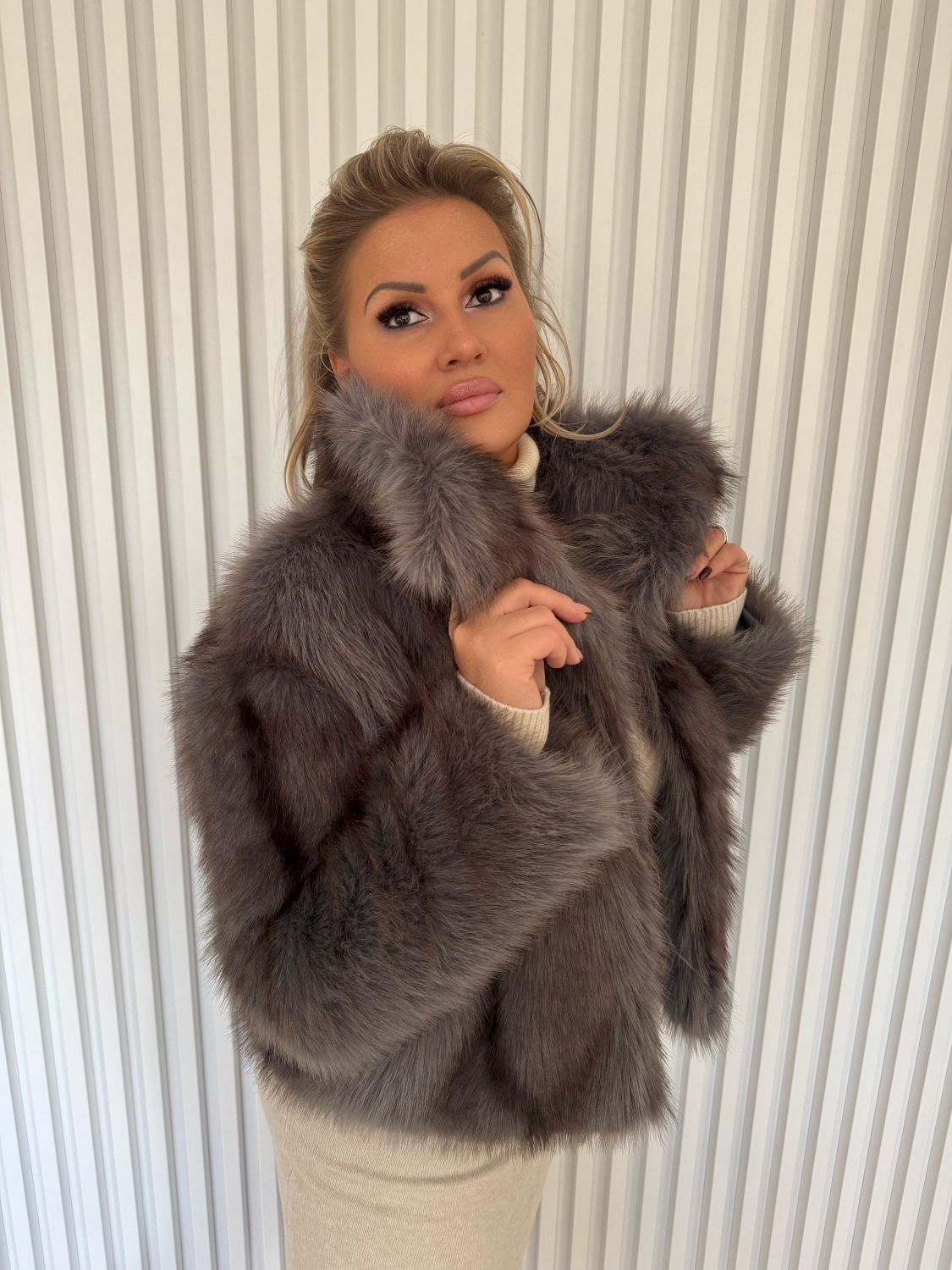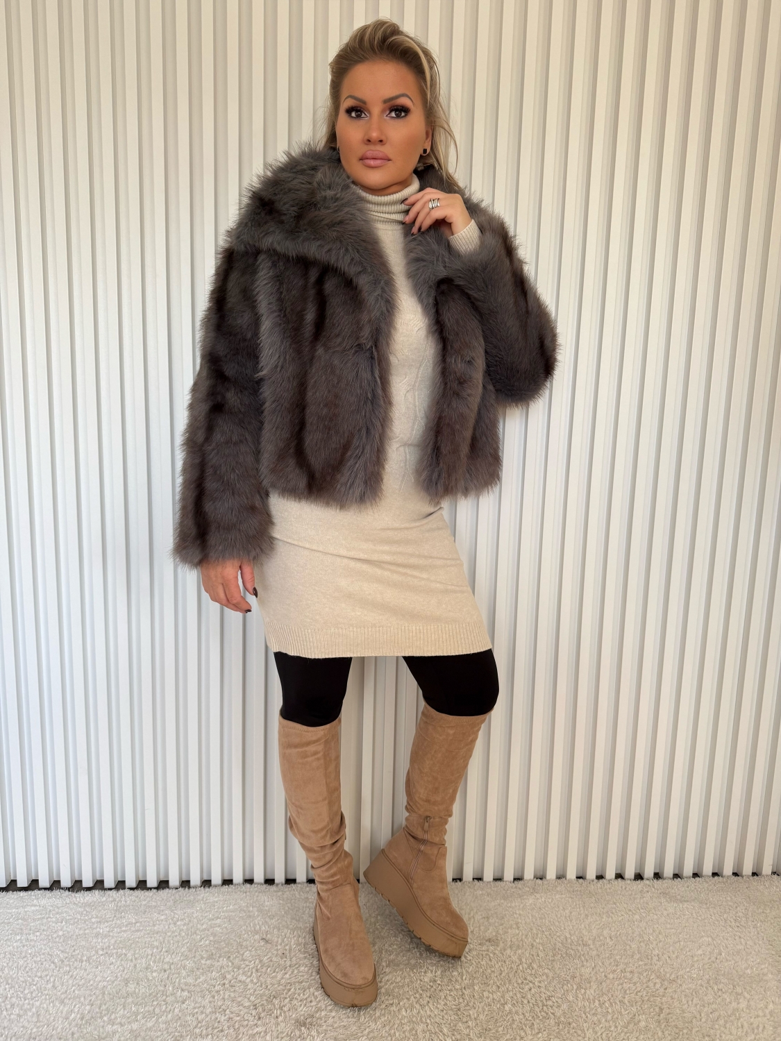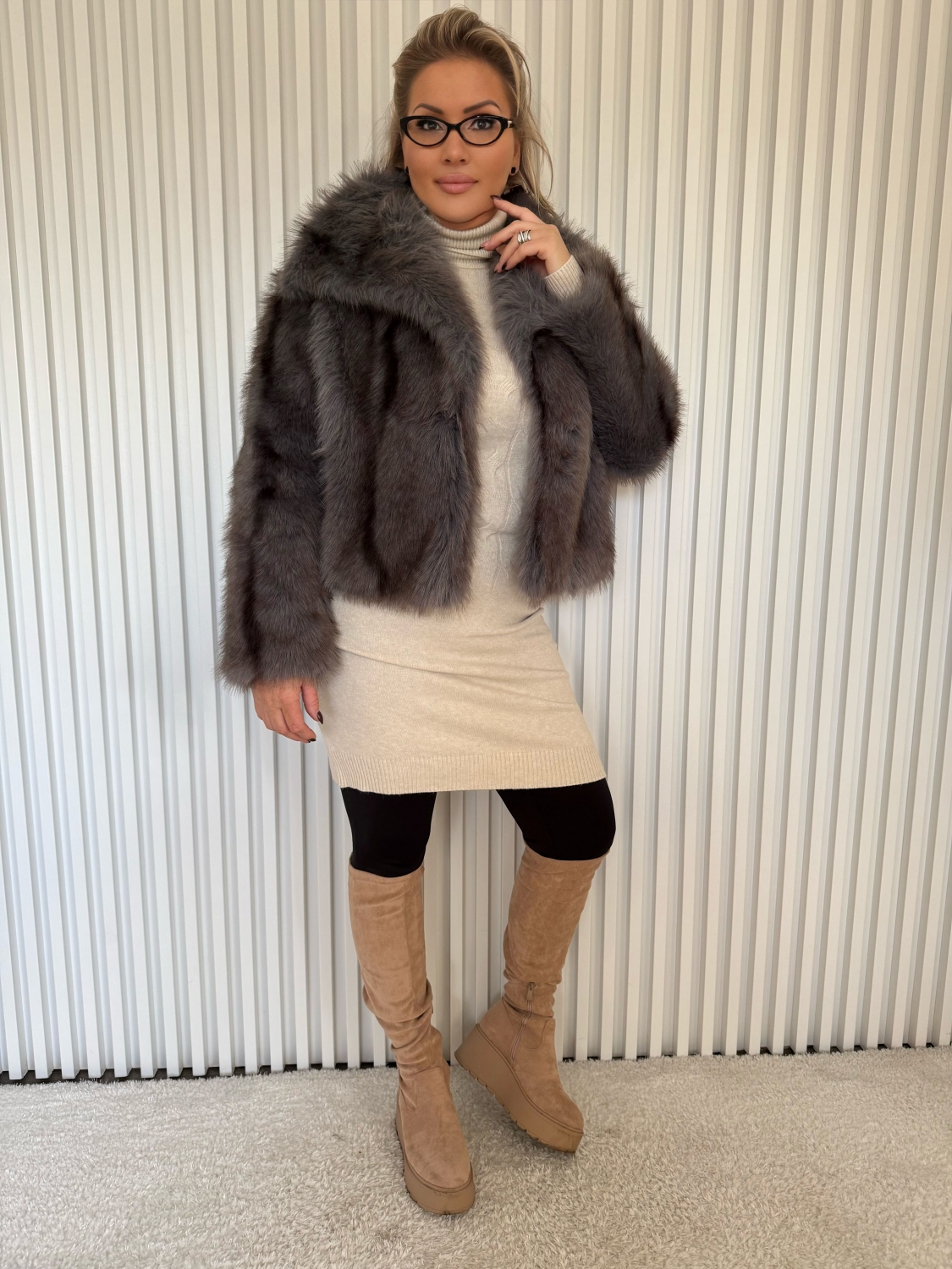 Dámský krémový kožešinový kabát s páskem a kapsami.
