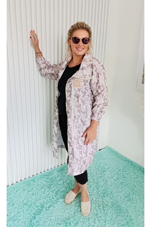 Dlouhá letní bunda v maskáčovém vzoru se zlatou aplikací.