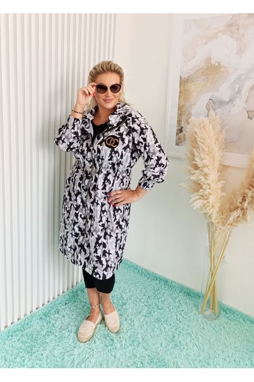 Zaujměte na první pohled s touto dlouhou letní bundou v moderním maskáčovém stylu, doplněnou o elegantní zlatou aplikaci inspirovanou ikonickými písmeny. Bunda v trendy designu, který je perfektní na přechodové období nebo chladnější letní dny.