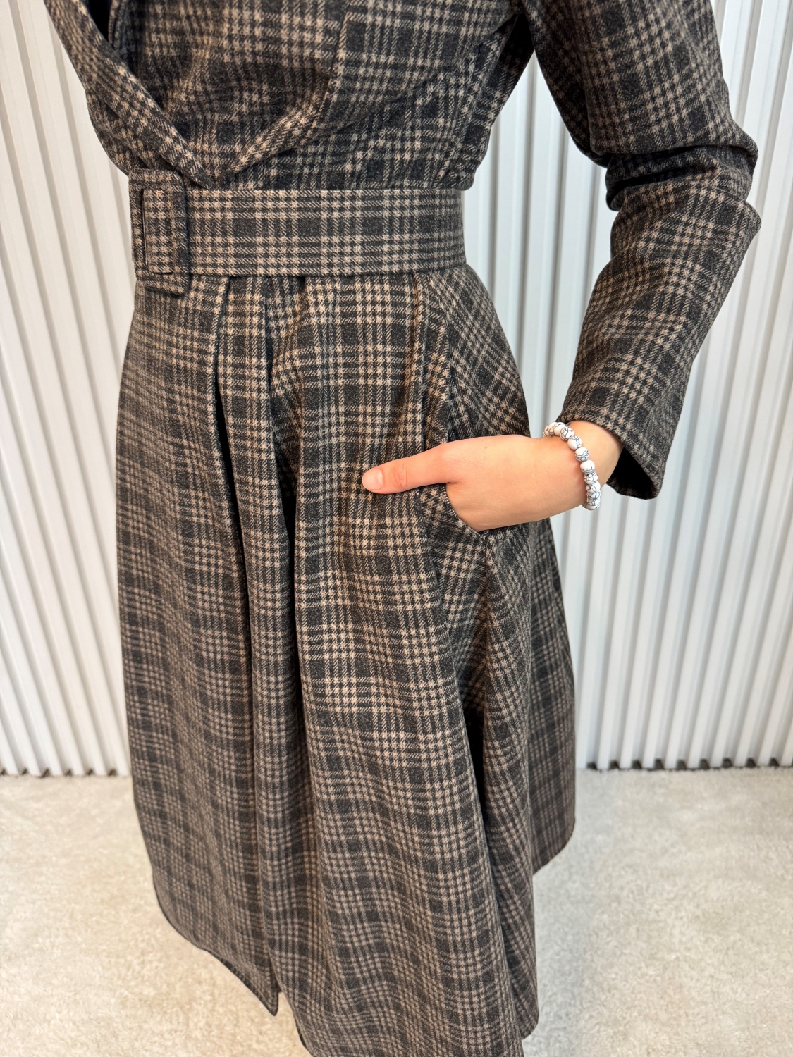 Dámský kostkovaný kabát Nina s páskem, se střihem do A.