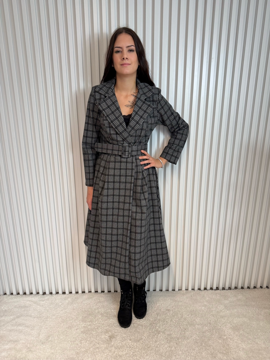 Dámský kostkovaný kabát Nina II s páskem, se střihem do A, v šedé barvě.