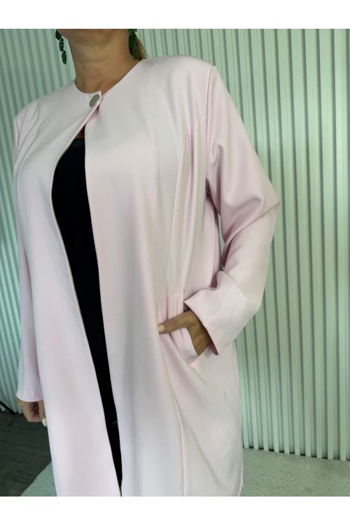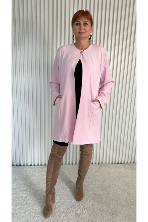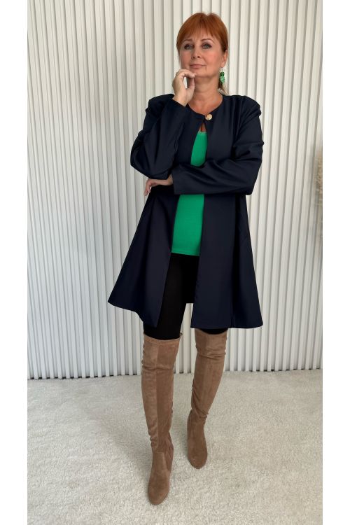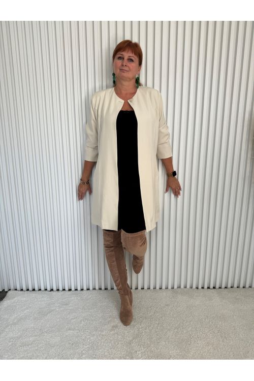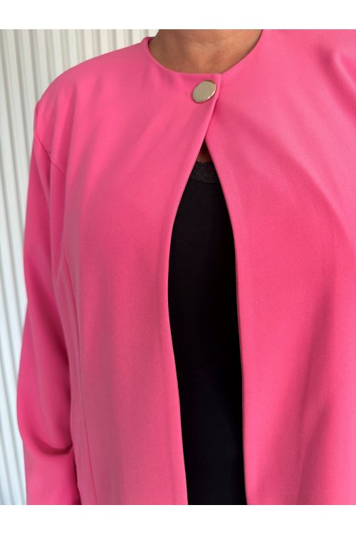 Sako má čistý, jednoduchý střih bez límce a je doplněno o kovové zapínání u krku, které dodává modelu moderní vzhled. Je ušito z kvalitního, lehce pružného materiálu, který se příjemně nosí a zároveň drží tvar.