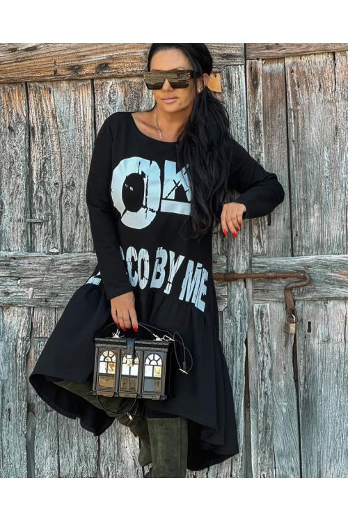 Dámské černé oversize šaty s tylovou sukní. Obvod přes prsa je 110 až 114cm, obvod přes boky je 140cm, délka je 100 cm. Materiál je bavlna s elastenem, sukně je tylová. Elegantní a stylový model.