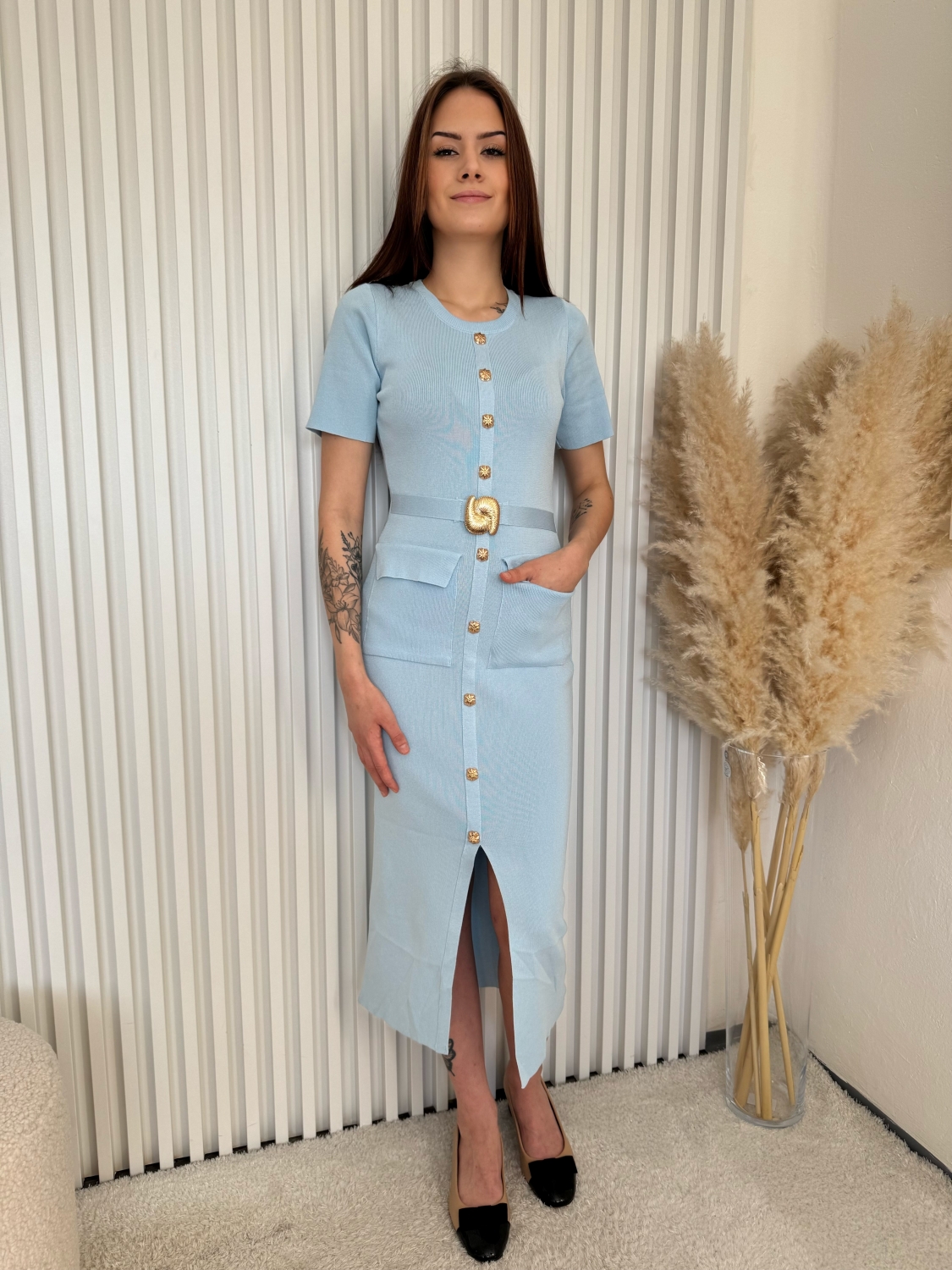 Dámské dlouhé modré elastické šaty Xenie na knoflíky s vázačkou v pase