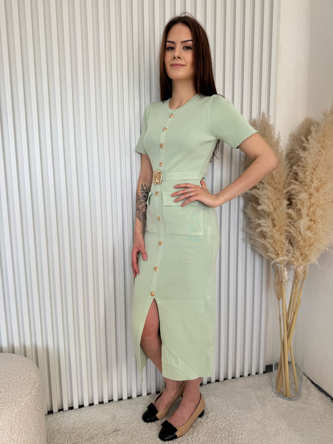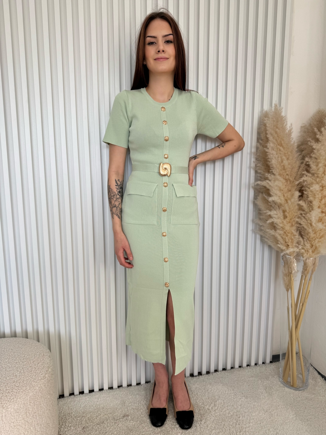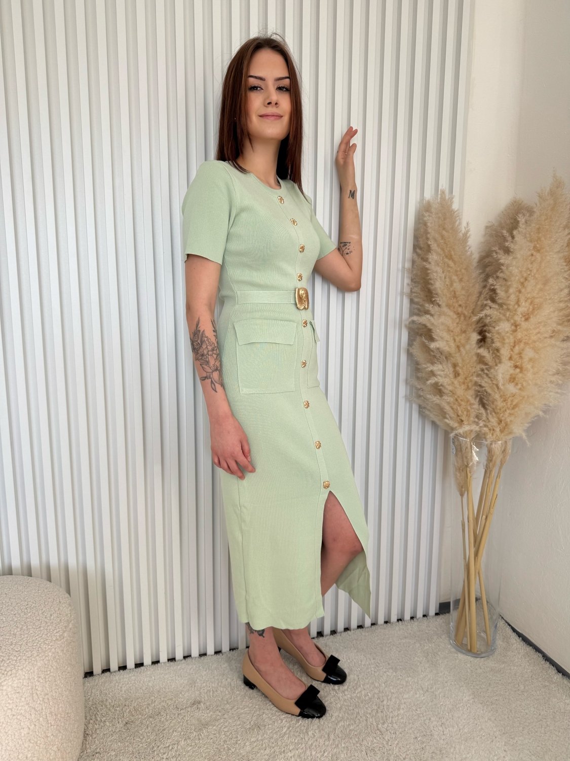 Dámské dlouhé mint elastické šaty Nina s kapsami a ozdobnou vázačkou v pase