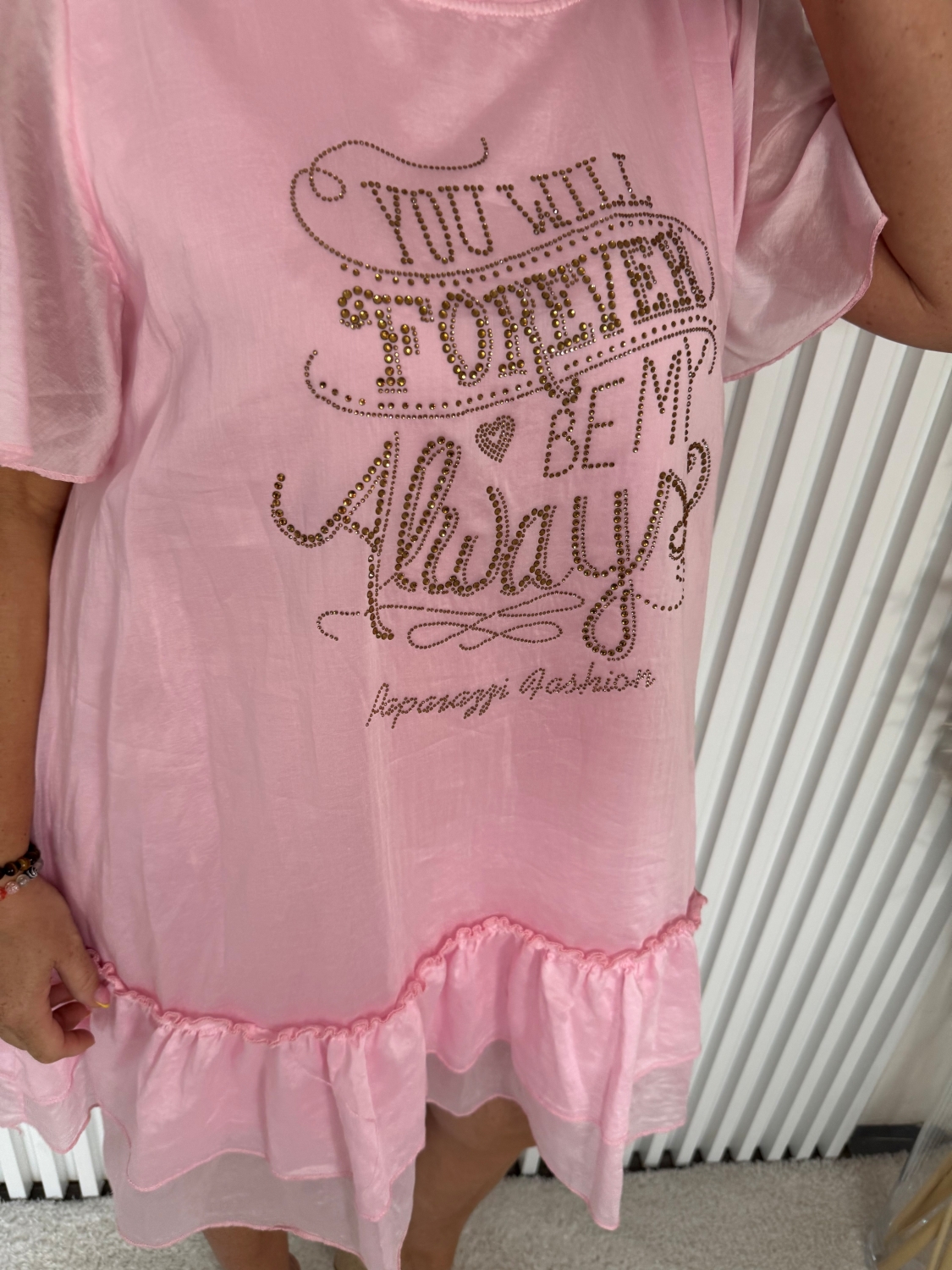 Střih: áčkový, volný, se sklady, krajkový výstřih, volánky na rukávech i spodním lemu