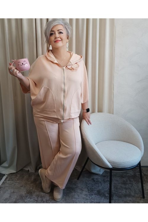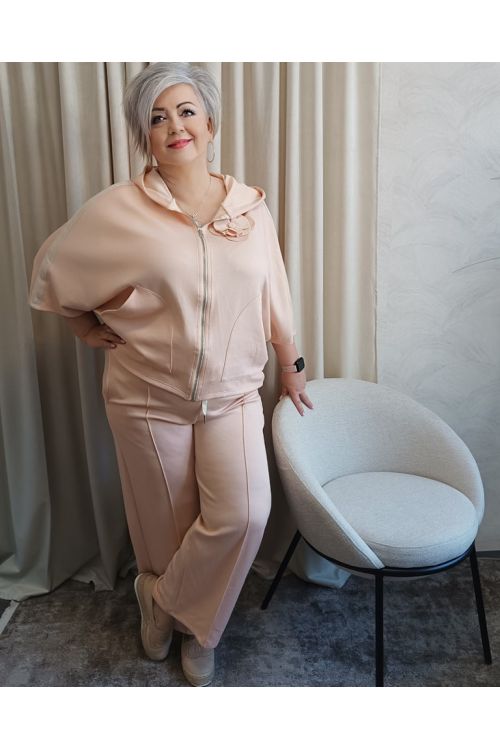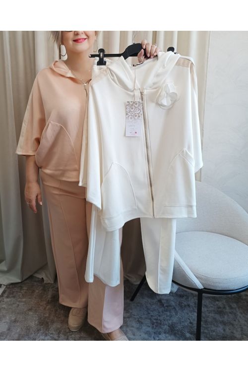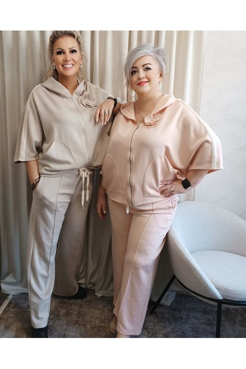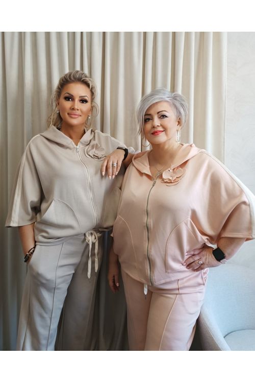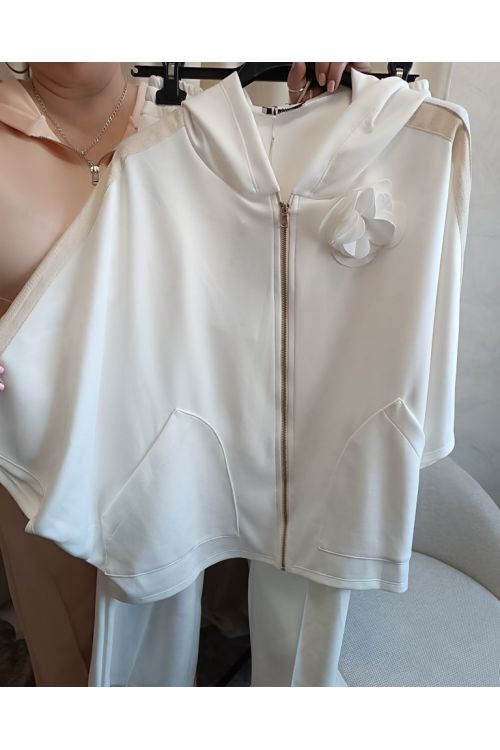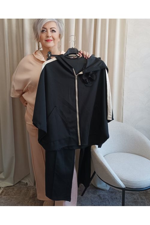 Dámská luxusní souprava pro všechny velikosti. Ideálně od velikosti 40 do 48. Mikina má netopýři střih a zapíná se na zip. Mikina má brož , která se dá odepnout. Mikina má kapuci. Kalhoty mají v pase gumu. Luxusní model do každého šatníku. Materiál je velmi příjemný,elastický, maselkový.