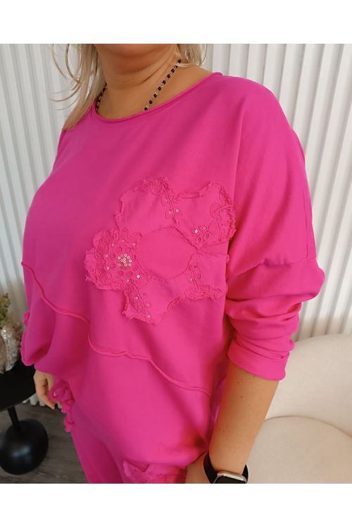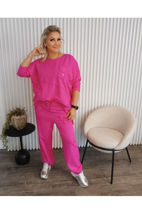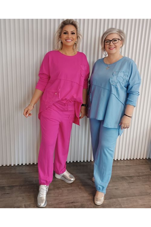 Dámský trendy souprava kalhot a mikiny v růžové a modré barvě. Souprava je zdobená aplikacemi květů. Kalhoty mají v pase gumu. Vhodné pro velikost 40 a výše. Krásný model na pohodu.