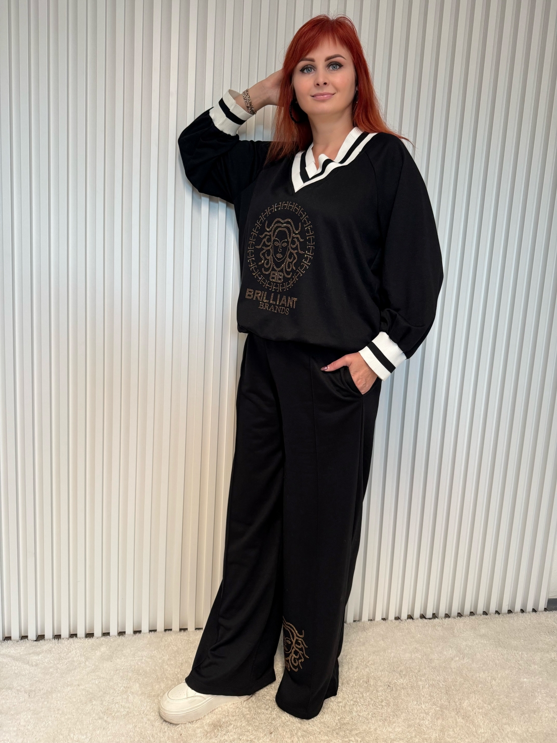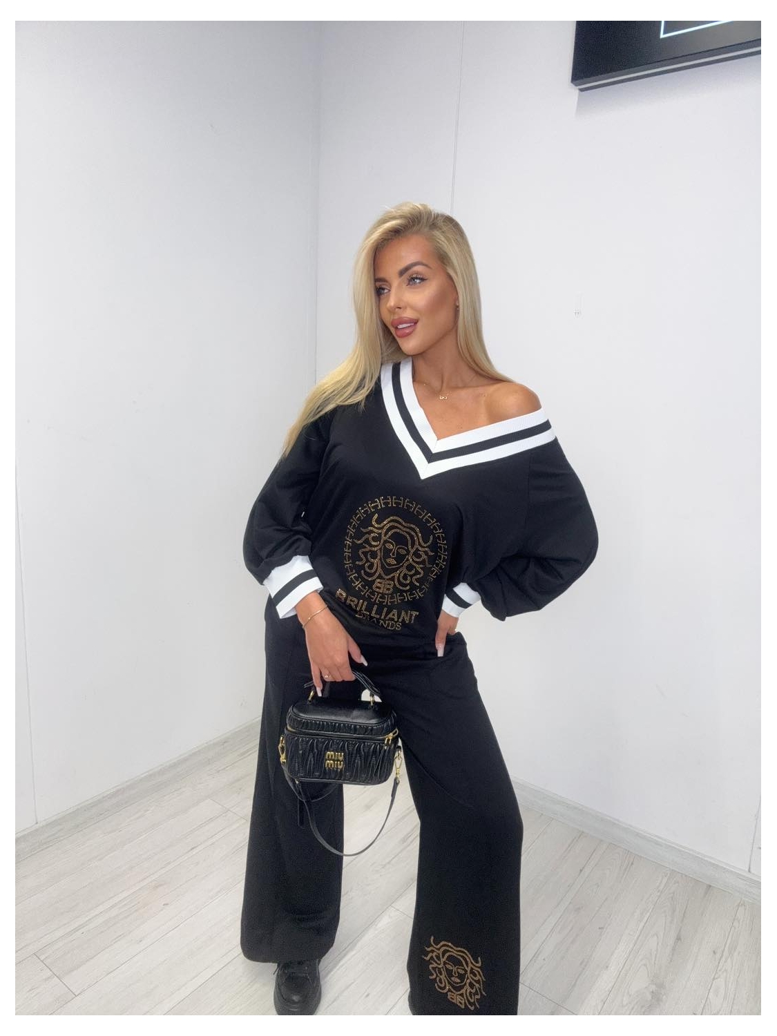 Dámská luxusní černá souprava mikiny a kalhot značky Paparazzi Fashion. Souprava má na mikině bílé lemy a zlatou aplikaci. Kalhoty mají v pase gumu a široké nohavice. Top model pro volný čas.