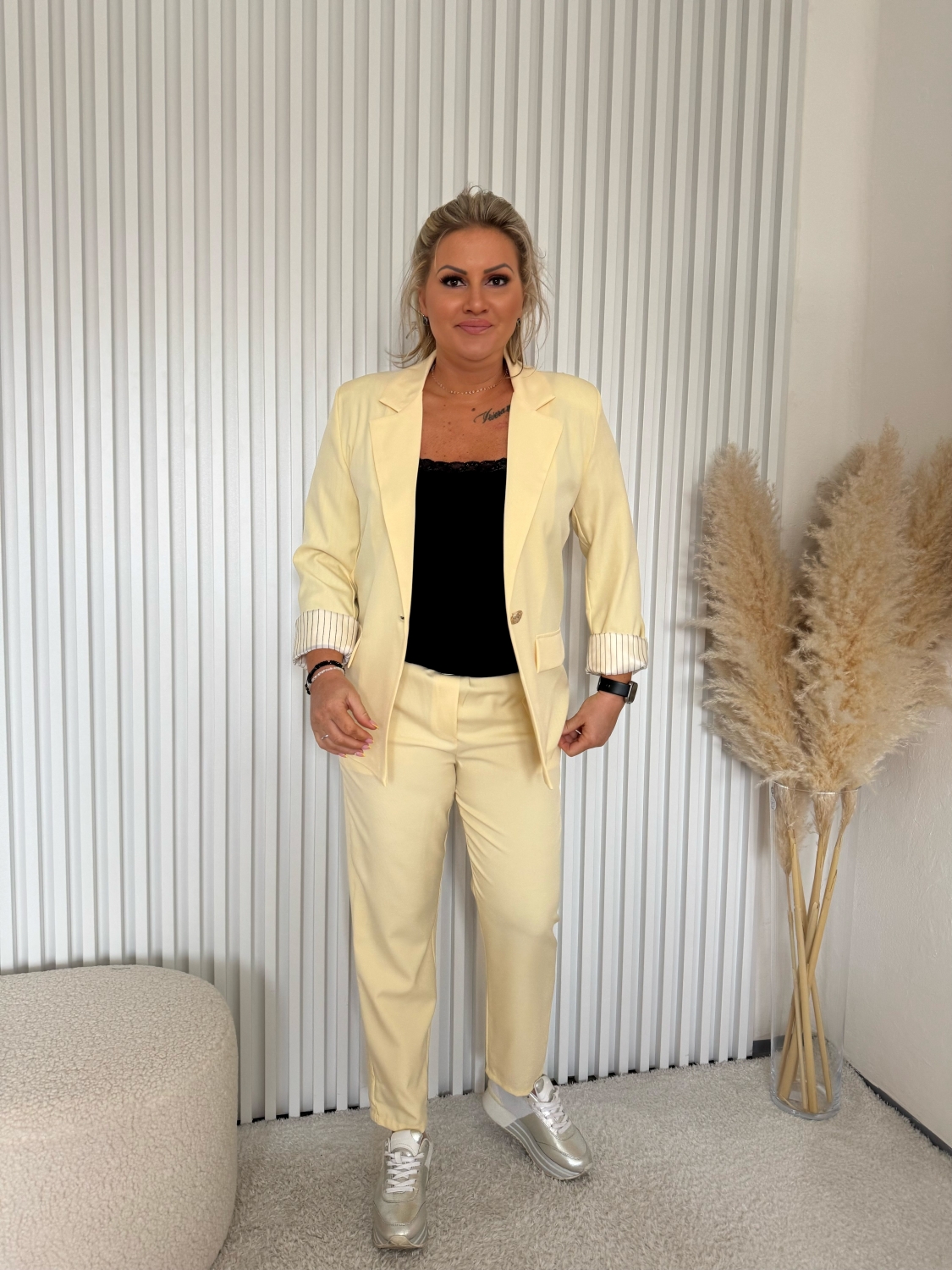 Dámský elegantní kalhotový kostým Dejna v béžové barvě je dokonalou volbou pro všechny ženy, které chtějí vypadat stylově a zároveň se cítit pohodlně. Tento kostým kombinuje moderní design s klasickými prvky, což z něj činí ideální kousek pro různé příležitosti – od pracovních schůzek po večerní akce. S jeho univerzálním vzhledem snadno zkombinujete další módní kousky a vytvoříte tak outfit, který oslní.