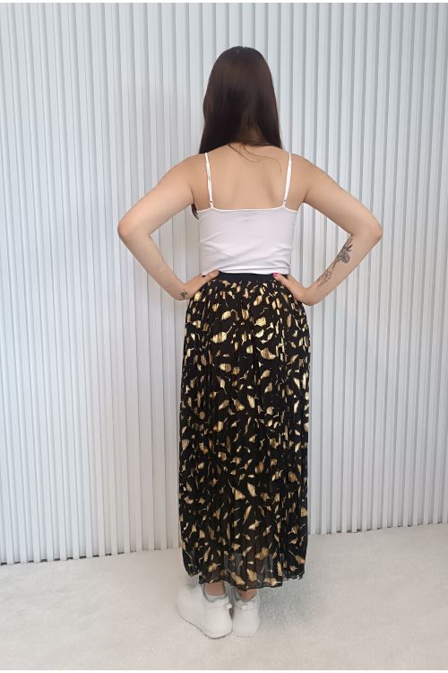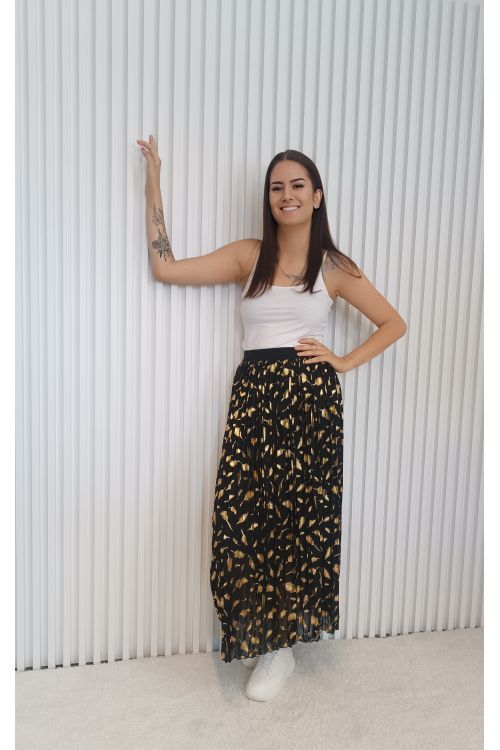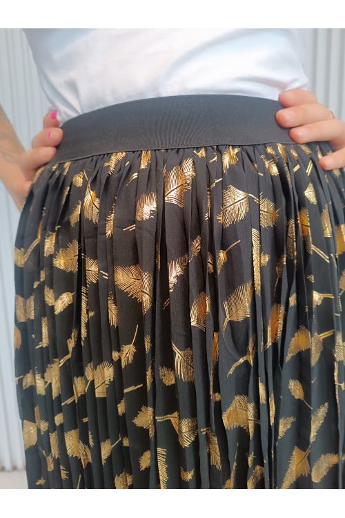 Stylová plisovaná sukně v černé barvě s efektním zlatým potiskem, který krásně odráží světlo.