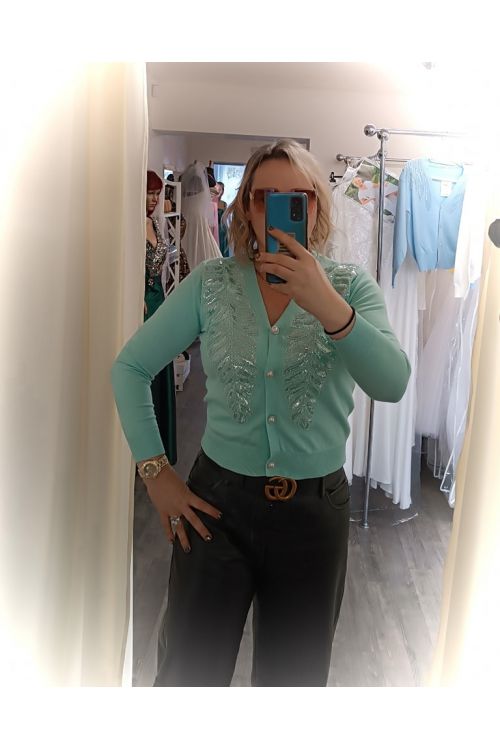 Dámský pletený svetr Natalie s flitrovou výšivkou, šedý / růžový, květinový motiv.