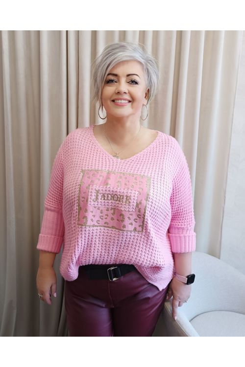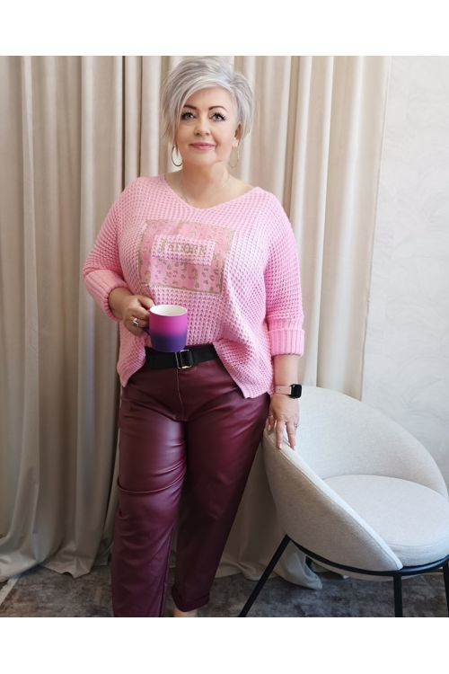 Dámský oversize svetřík v růžové barvě. Svetr má výstřih do V a vaflový vzor. Na předním díle je aplikace. Svetr je z příjemného elastického a nekousavého materiálu. Vhodný pro všechny velikosti. Módní kousek pro různé stylizace.