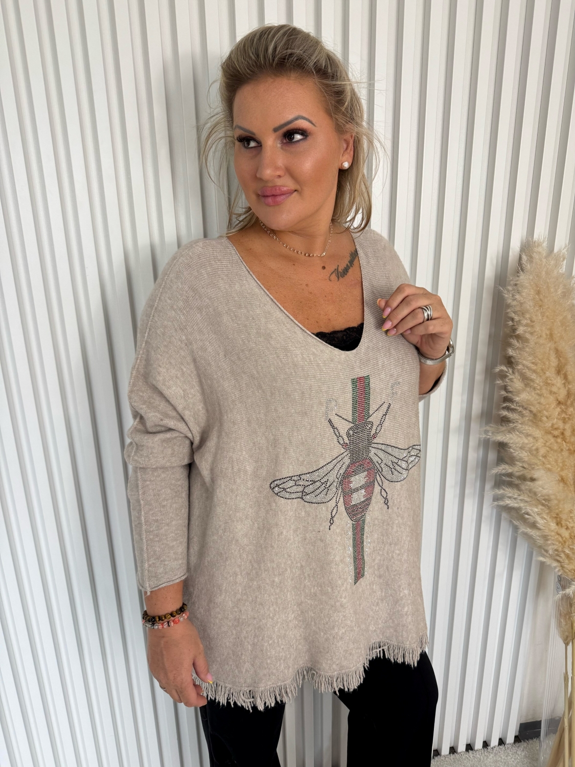 Svetr Claudie je ideální volbou pro chladné dny, kdy hledáte něco teplého a pohodlného. Díky trendy třásním na spodním lemu a rukávech se budete cítit nejen útulně, ale také velmi módně. Můžete ho nosit jak k džínům, tak k legínám nebo sukni, čímž vytvoříte jedinečný a stylový vzhled. Tento svetr je skvělý jak na každodenní nošení, tak na zvláštní příležitosti.