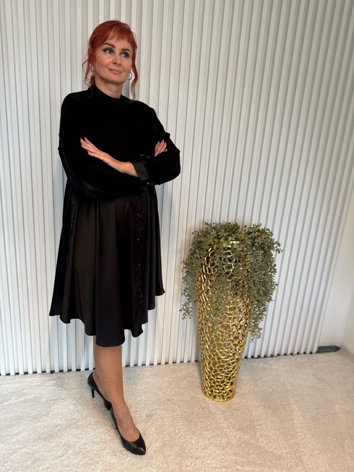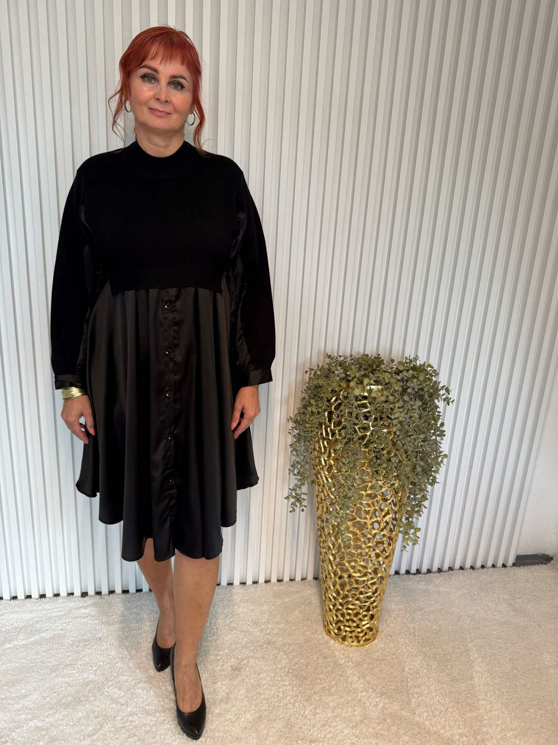 Elegantní černé šaty, které spojují pohodlí úpletu a jemnost saténu v jednom originálním kousku.