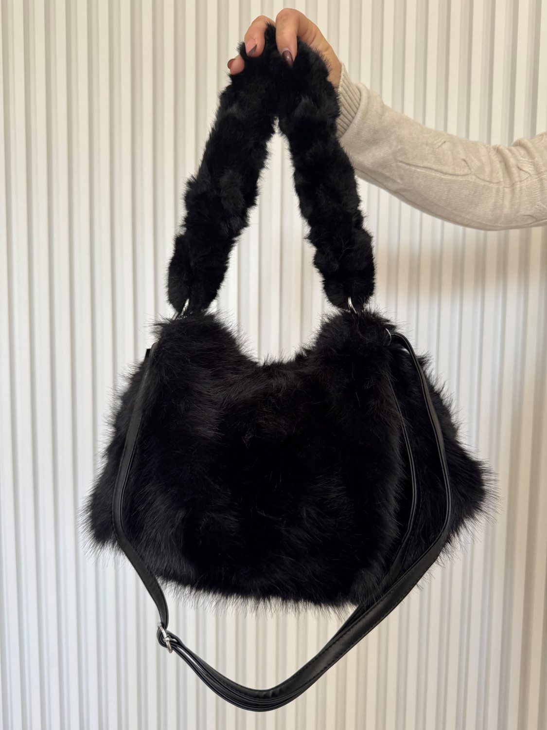 Elegantní dámská kožešinová kabelka v černé barvě.