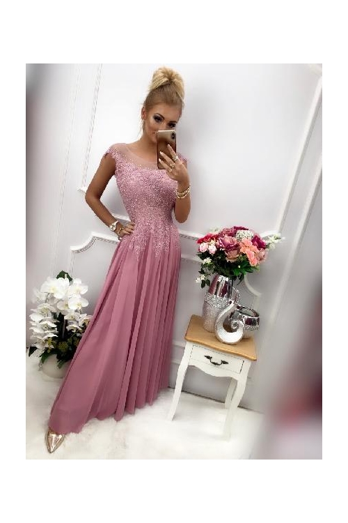 Dámské dlouhé růžové společenské šaty AIDA bez rukávů. Šaty jsou bohatě zdobené kamínkama v barvě šatů a krajkou. Šaty jsou vzadu na zip a mají lehkou saténovou podšívku. Velikost šatů je 54: obvod hrudníku je 113 cm, obvod pasu je 106 cm, obvod boků je 128 cm a délka šatů je 156cm. Tyto šaty jsou skvělou volbou a jako dobrý základ pro look na různé příležitosti.