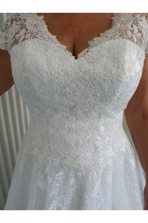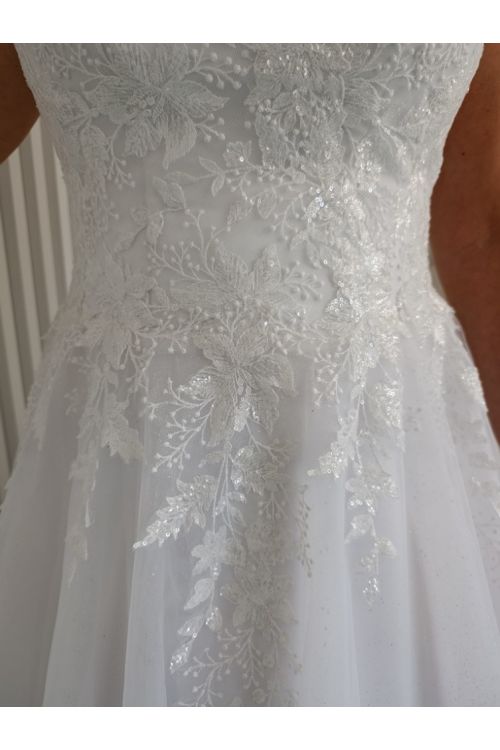 Velikost šatů je 42 a 44. Šaty jsou v barvě královské modré. Vrchní díl je zdobený krajkou a flitrama v barvě šatů. Na předním díle je delší rozparek. Šaty mají malý rukávek. Materiál je lehounký a vzadu jsou šaty na zip. Složení: 80% viskoza, 15% polyester, 5% elastan.
