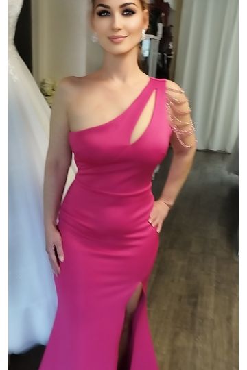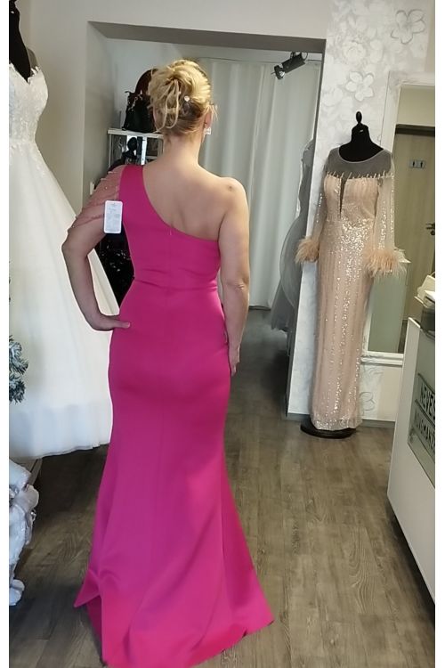 Velikost šatů je 38, barva malinová. Šaty jsou přes jedno rameno bohatě zdobené korálkami a mají na předním díle delší rozparek. Šaty jsou mírně elastické a zdůrazňují krásnou siluetu. Šaty jsou vzadu na zip. Složení: 97 % polyester, 3% elastan. V těchto šatech budete vypadat elegantně při každé společenské události. Obvod hrudníku šatů je 89cm, obvod pasu šatů je 70cm, obvod boků šatů 90cm, délka šatů od průramku 138cm.
